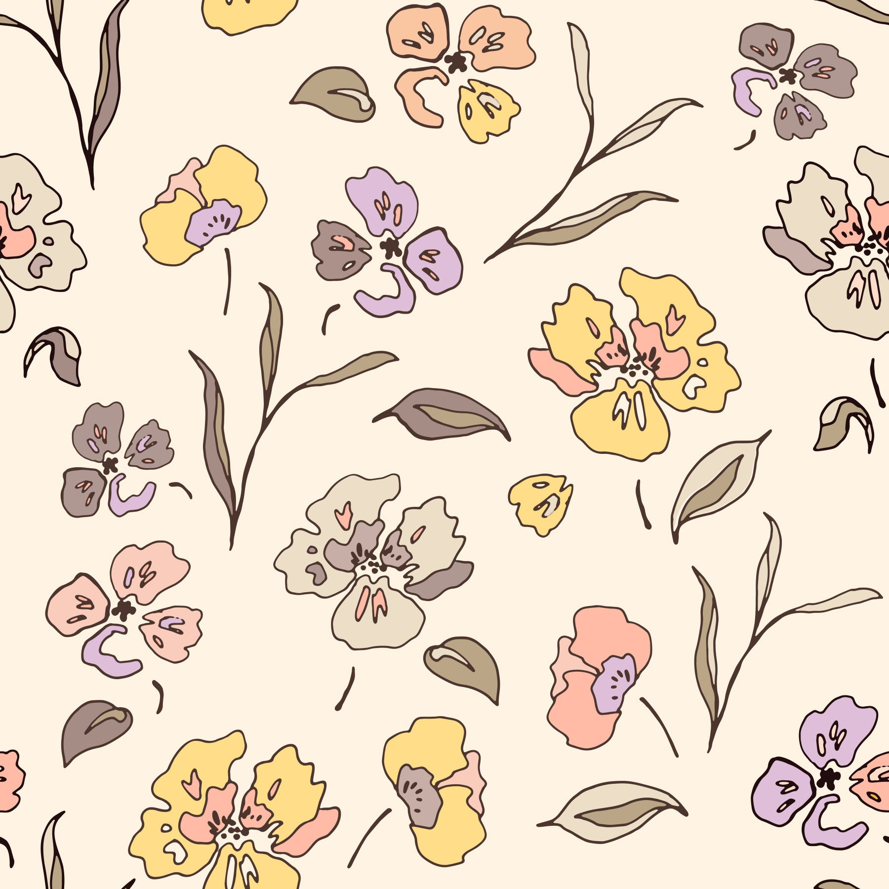 Retro hand-drawn floral wallpaper in muted tones.