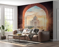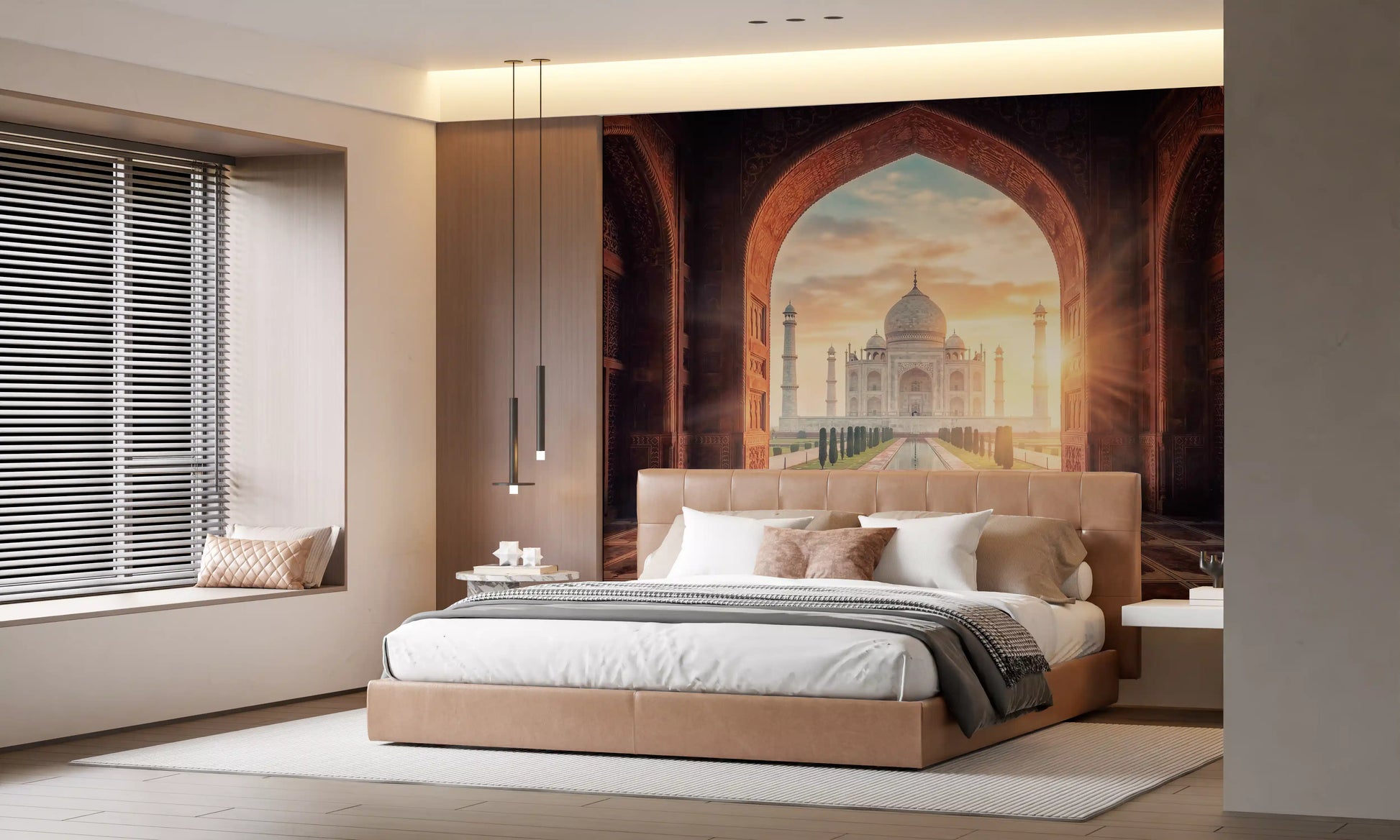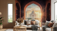Transform your living space with this breathtaking wallpaper for walls, capturing the iconic Taj Mahal through a magnificent, intricately carved archway. Rich reddish-brown sandstone tones of the arch frame the pristine white marble monument. The scene illuminates with the warm, ethereal glow of a golden hour sunset. Delicate light reflects on the serene pools, presenting a majestic vista. This design brings ancient grandeur and cultural richness into any room. It creates a stunning focal point, perfect for a sophisticated living room, an elegant dining area, or a tranquil bedroom retreat. The interplay of light and shadow, combined with historical architecture, effortlessly elevates your interior ambiance.