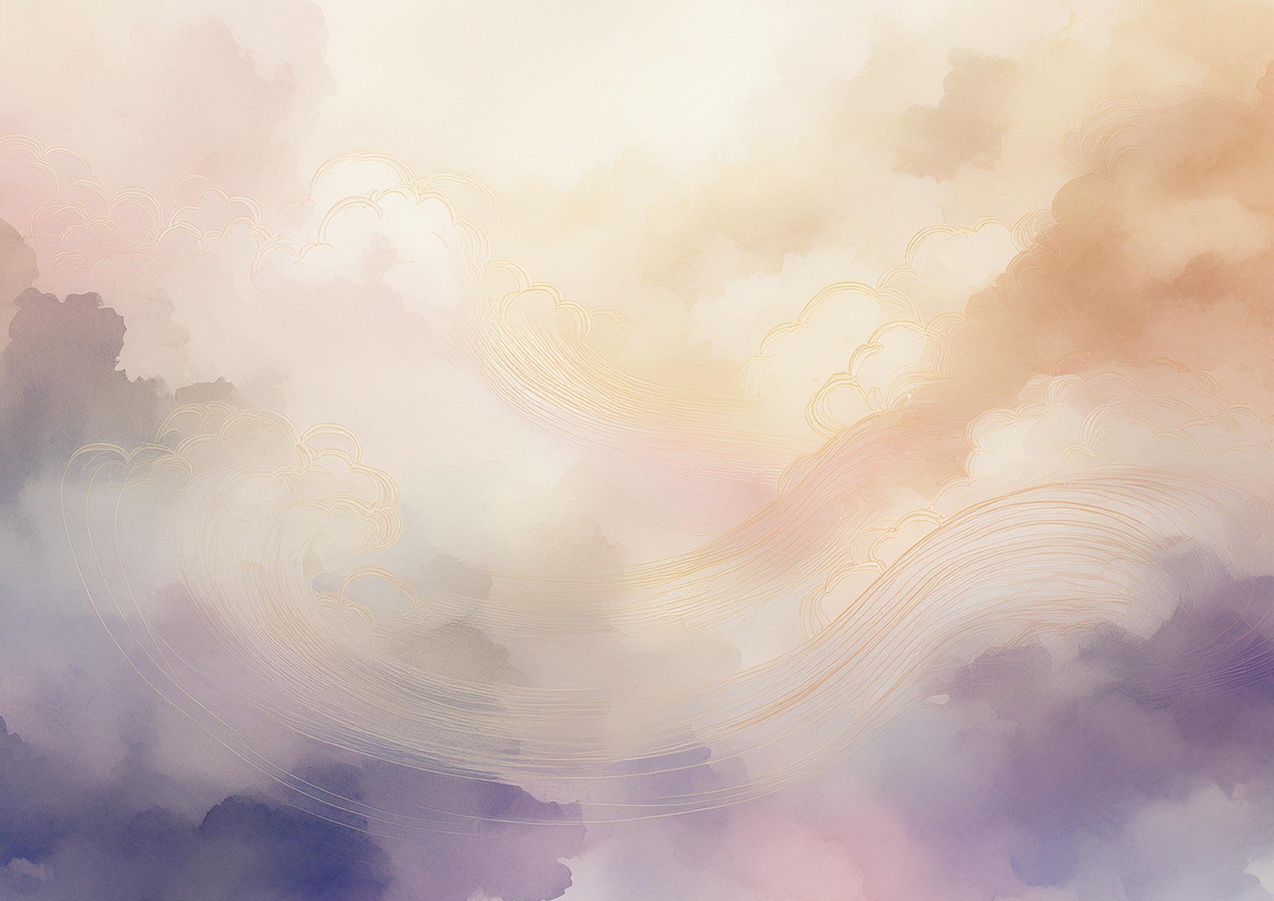 Experience the gentle caress of a soft breeze with this captivating wallpaper. Delicate watercolor washes in calming tones of blush pink, soft lavender, and creamy beige create a sense of ethereal serenity. The gold lines, gracefully tracing the form of clouds, evoke a feeling of movement and fluidity, as if the wind itself is whispering across the sky. This wallpaper's design is sophisticated yet calming, perfect for creating a tranquil and relaxing environment in bedrooms, living rooms, or even meditation spaces. Its subtle elegance and calming colors make it a versatile choice for various interior styles.