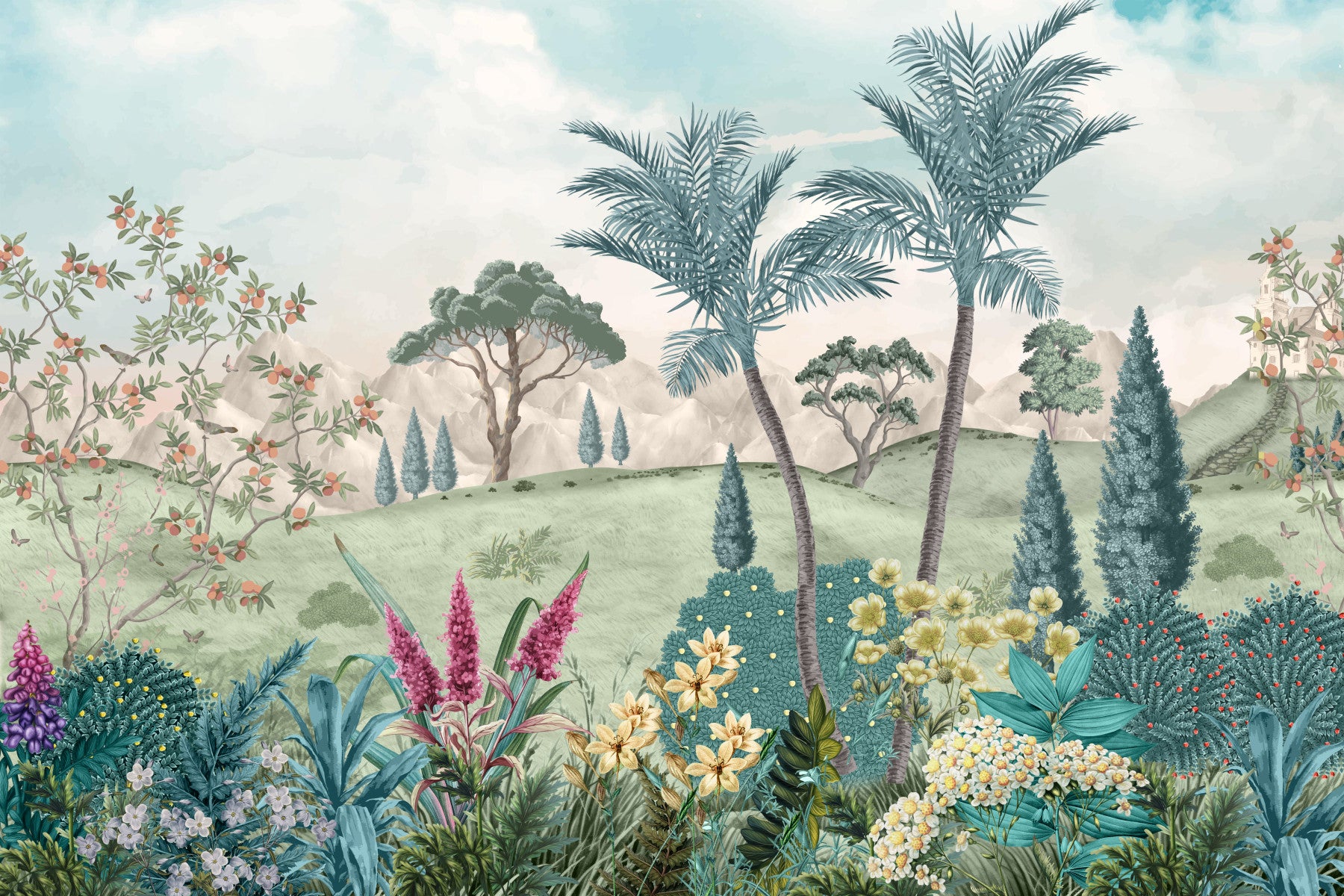 Escape to a peaceful paradise with this enchanting wallpaper. The design showcases stylised palm trees amidst rolling hills and an array of delicate flowers, all rendered in a soft, watercolour style. The cool greens, blues, and gentle pinks create a soothing and relaxing vibe, infusing tranquility. This wallpaper for walls is an exceptional choice for a bedroom, bathroom or nursery. Its design nicely supports relaxing modern, vintage or even Scandinavian design styles.