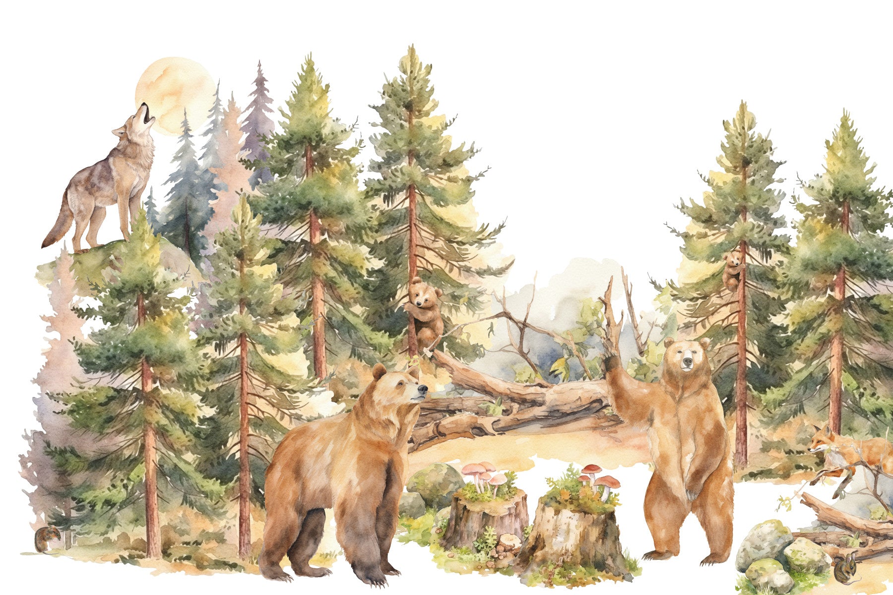 Invite a tranquil woodland scene into your home with this artful wallpaper by Uta Naumann. A watercolour wolf howls to the moon, while friendly bears and a playful fox roam among towering pine trees. This wallpaper for walls features a calming colour palette of greens, browns and soft yellows that create a relaxed, nature-inspired aesthetic. Ideal for a nursery, children’s room or study, it will infuse any interior with a sense of peace and wonder.