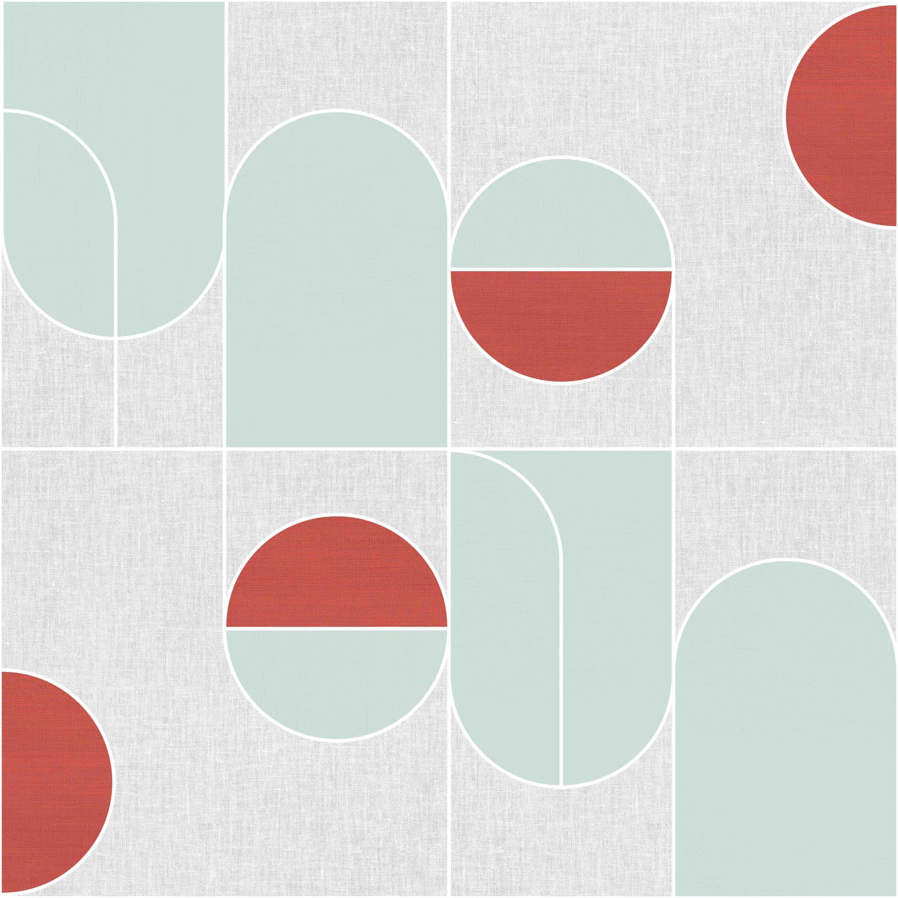 Geometric 07 presents a sophisticated interplay of shapes and textures. This wallpaper features a minimalist geometric arrangement with rounded elements, strategically utilizing soft teal and warm terracotta hues against a textured, neutral backdrop. The composition showcases a grid-like structure where semi-circles and circular fragments are juxtaposed, creating a balanced yet dynamic visual experience. The subtle textural detail adds depth, evoking a sense of understated elegance and modern simplicity. This design is perfect for those seeking a calming and visually stimulating background that enhances without overwhelming.