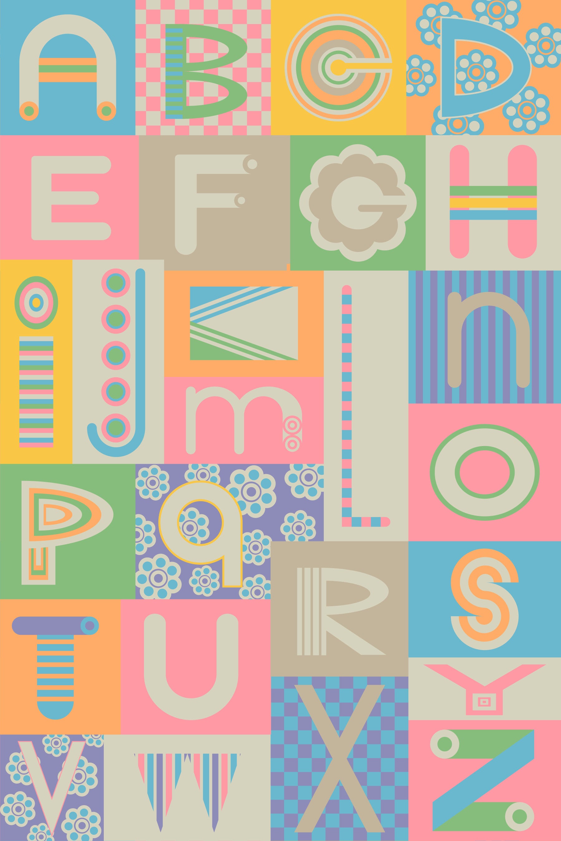 Pastel Colors Alphabet Graphic blocks striking wholesome vivid letter forms.