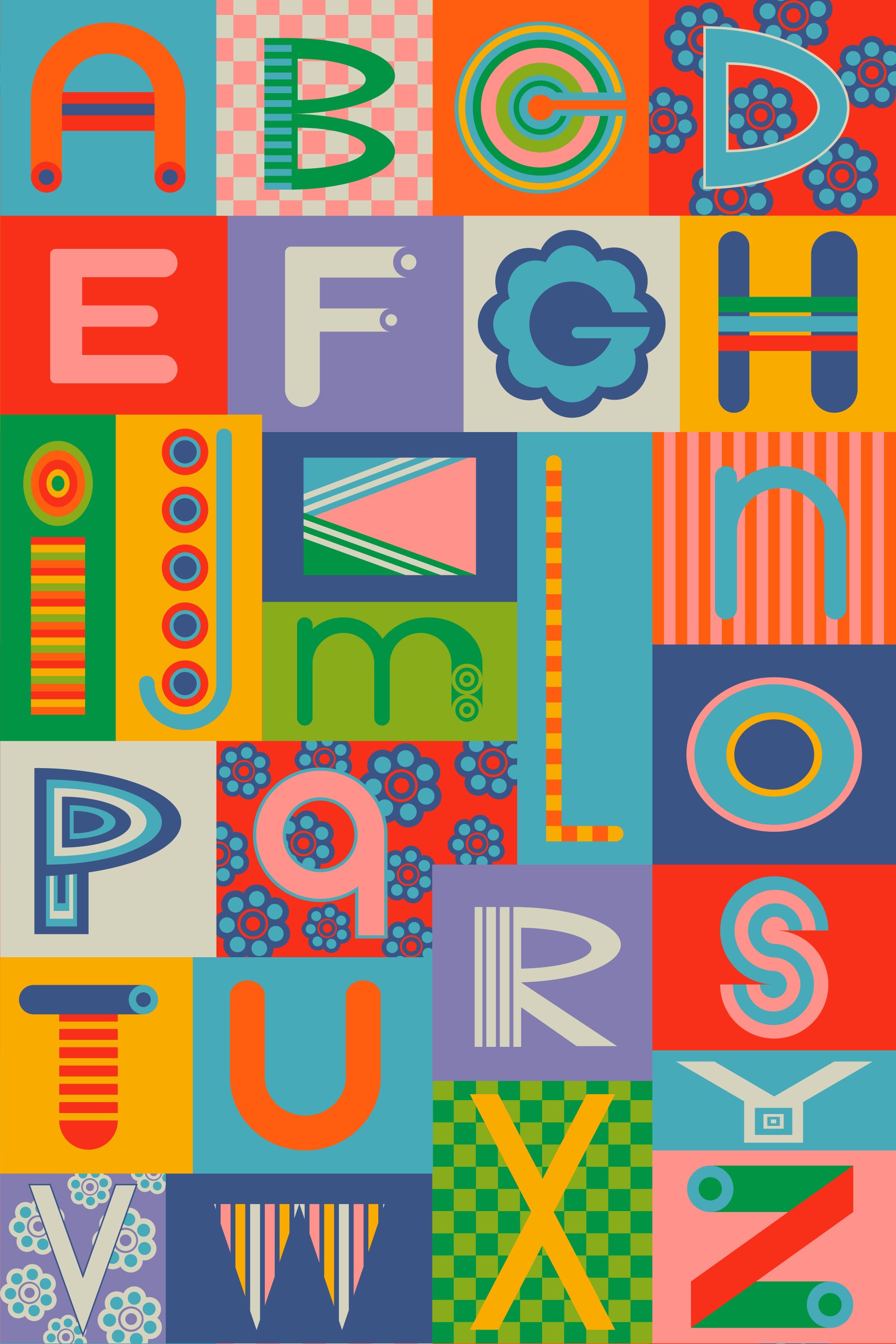 Playful Retro Alphabet Graphic wall cover pop art inspired design.