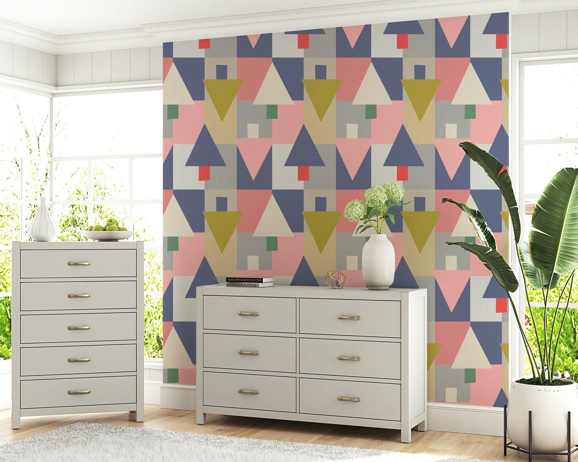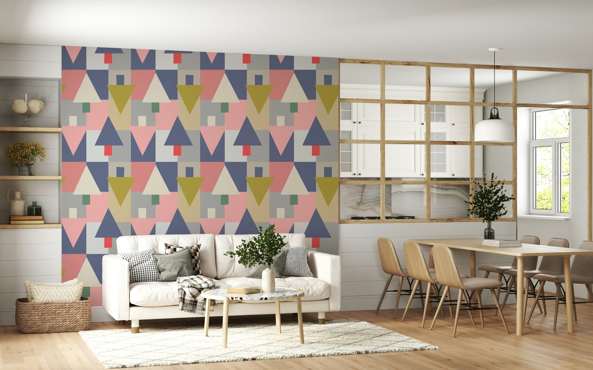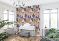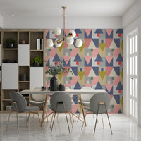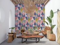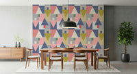 Elevate your living space with this geometric wallpaper for walls. Its playful yet sophisticated design features a balanced composition of triangles, squares, and rectangles. The colour palette blends muted pinks, greys, blues, and olives, creating a calming and inviting ambiance. This wallpaper complements modern and minimalist interiors. It works well in a living room, bedroom, or hallway. Let the geometric pattern bring an artistic flair and structured elegance to your décor. It brings personality and unique aesthetics to any room. Perfect for homeowners with sophisticated, eclectic tastes.