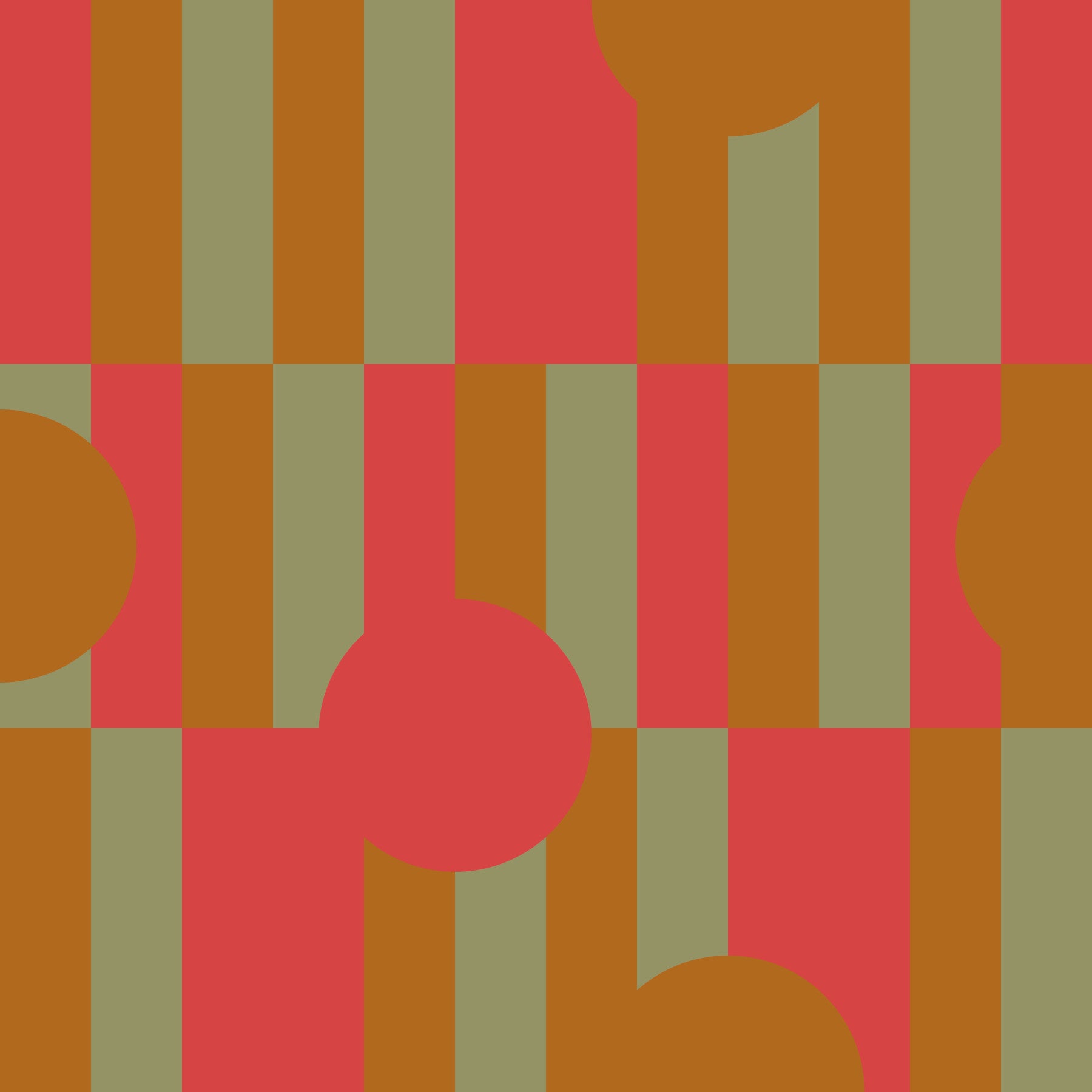 This design celebrates modern art with a playful twist. A repeating pattern of circles and rectangles in red, olive, and brown brings a unique style to walls. It adds visual interest to living spaces, bedrooms, or playrooms. Select this wallpaper for walls and transform your space. The bold patterns give a new feel, while the warm colors pair well with a variety of furniture. Brighten your home with simple yet striking style.