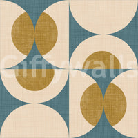 Elevate your interior with this simple geometric design. The wallpaper arranges circles and semicircles in shades of light cream, rustic gold, and teal, creating a seamless, tile-like motif. Install this wallpaper for walls in dining rooms, living rooms, or even a home office to brighten up the space. The pattern subtly complements a variety of interior styles, from mid-century to Scandinavian to modern. The textured design adds depth.
