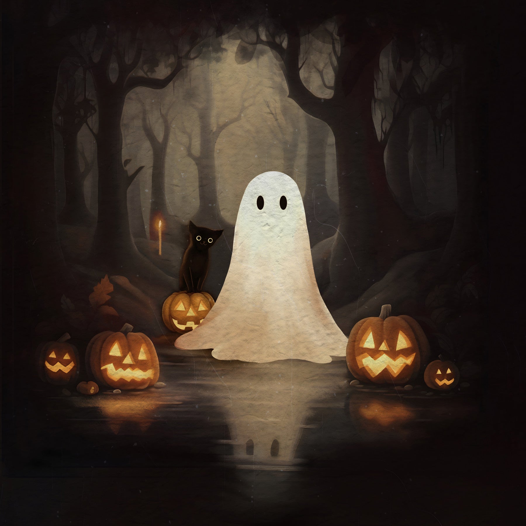 Wander into the whimsical world of Ghost and Black Cat a hauntingly adorable wallpaper that captures the spirit of Halloween with a touch of fairytale charm. Set against a backdrop of a misty forest bathed in the soft glow of candlelight, a friendly ghost stands surrounded by grinning jack-o'-lanterns, their warm light reflecting on a mysterious surface. A sleek black cat, perched regally atop one of the pumpkins, observes the scene with wide, curious eyes. This enchanting scene evokes a sense of playful mystery, blending spooky aesthetics with cute character designs. The wallpaper's soft textures and muted color palette create a vintage, storybook feel, perfect for adding a touch of Halloween magic to your digital space without sacrificing elegance.