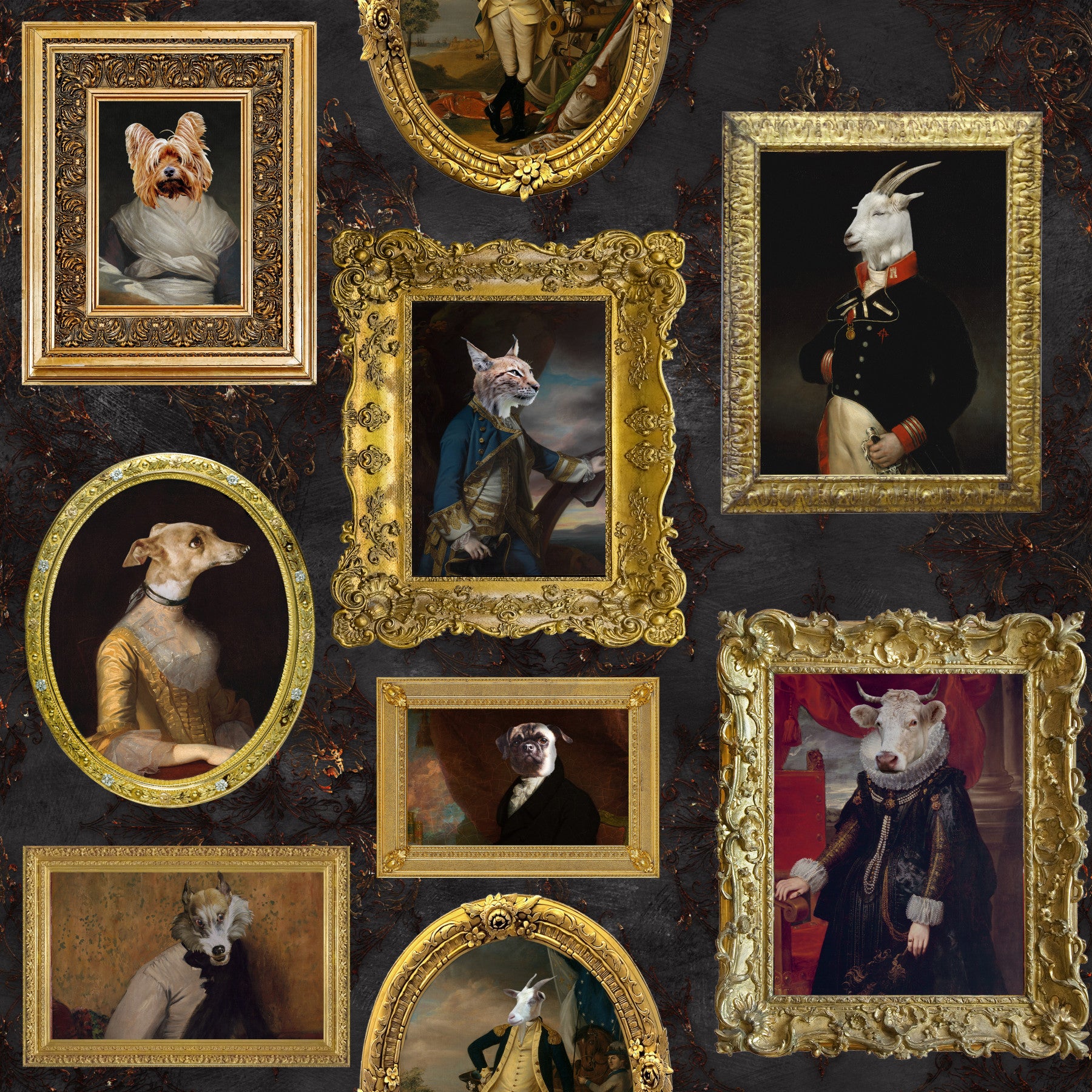 Transform your space with this quirky yet elegant wallpaper by Uta Naumann, featuring dignified animal portraits encased in elaborate gold frames. From a noble goat to a regal dog, each animal is dressed in period clothing, creating a humorous twist on classic aristocracy. The design sits against a dark textured background that enhances the richness of the gold. Ideal for a dining room, library, or even a bedroom, this wallpaper for walls introduces a refined yet playful atmosphere. Let it become the centrepiece of your decor, adding character and charm to any room.