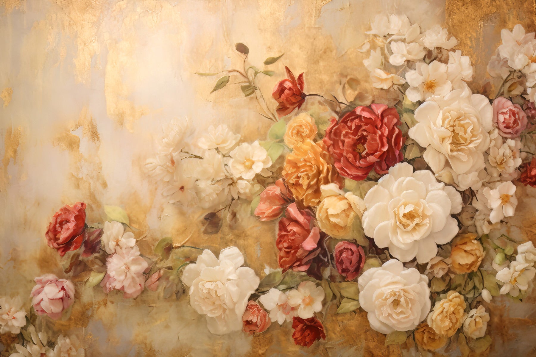 Invite nature's charm indoors with this floral wallpaper. Red, peach, and ivory flowers meet a golden backdrop, creating a luxurious effect. This wallpaper for walls adds elegance to living rooms, bedrooms, or dining areas. The design brings sophisticated style and gives interiors a romantic, warm feel. Perfect for creating a cozy, inviting space with visual appeal.