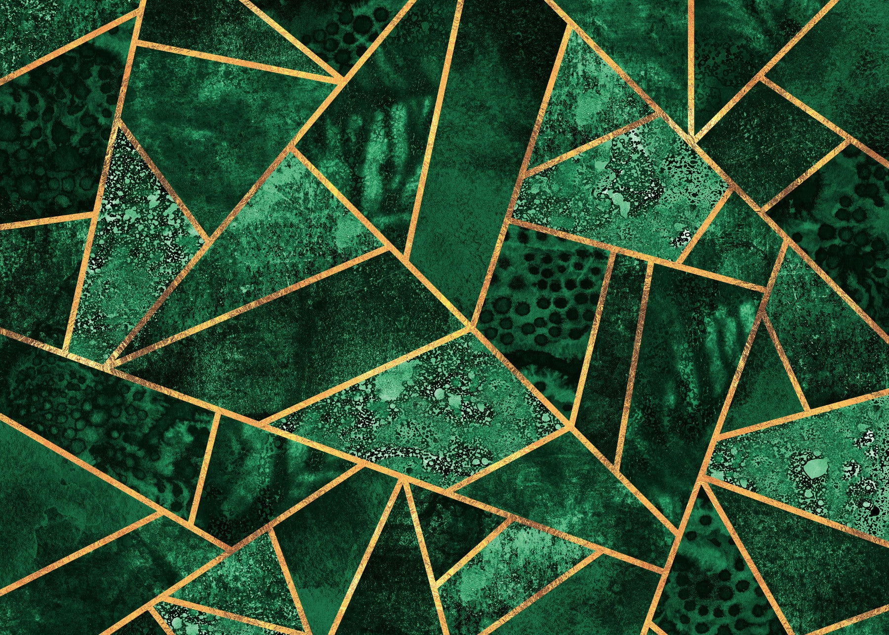Embrace the allure of the natural world with Gilded Geo Green a wallpaper design that marries the earthy tones of emerald and jade with the opulent gleam of gold. This abstract geometric pattern features fragmented shapes in various shades of deep green, creating a rich and textured visual experience. The striking contrast of the verdant backdrop against the shimmering golden lines that define each form evokes a sense of refined luxury. The intricate details within each geometric segment, ranging from subtle marbling to speckled textures, add depth and dimension. 'Gilded Geo Green' brings a sophisticated, organic aesthetic to any space, imbuing it with a sense of tranquility and understated elegance. Perfect for creating a statement wall or adding a touch of modern sophistication to your device.