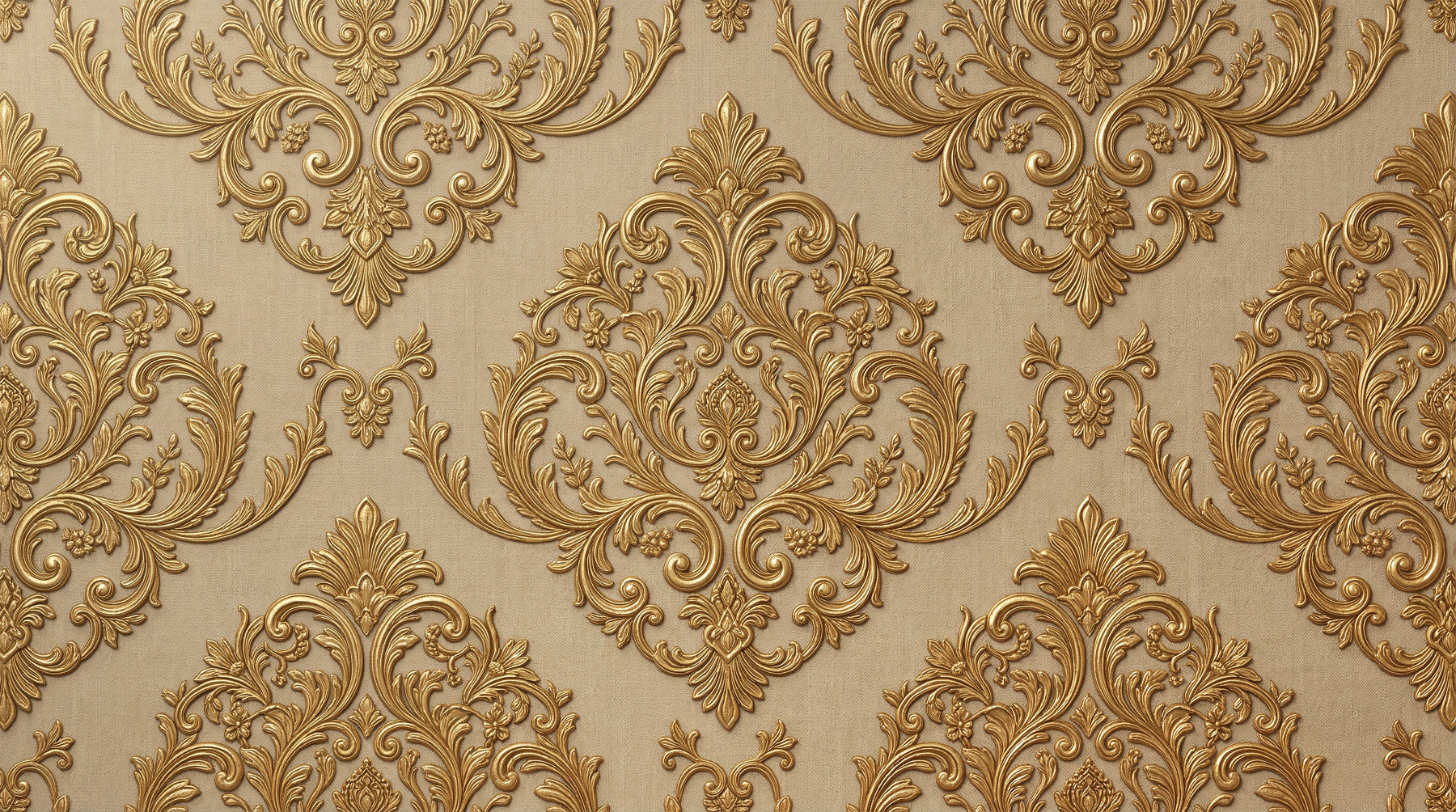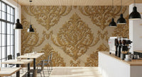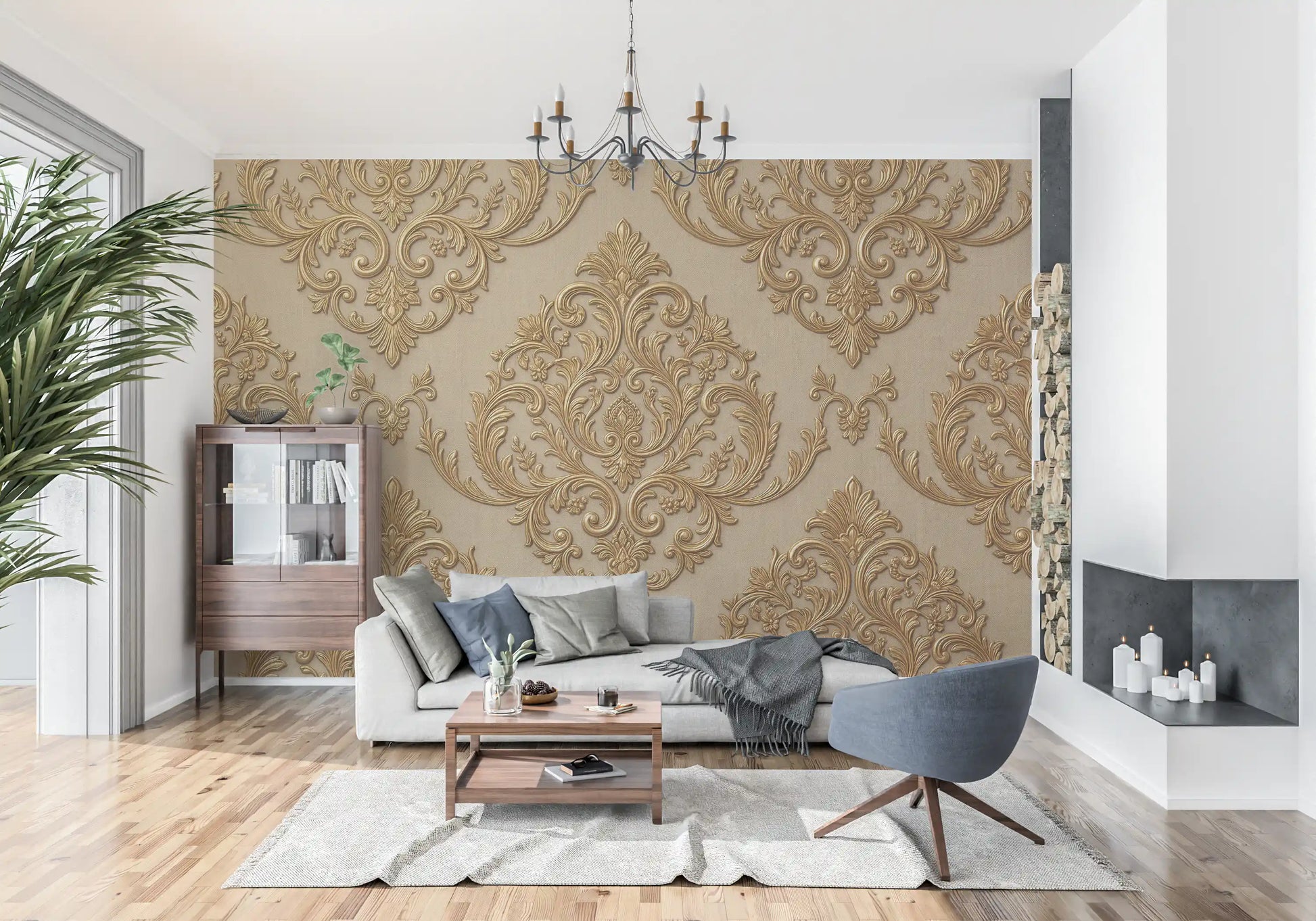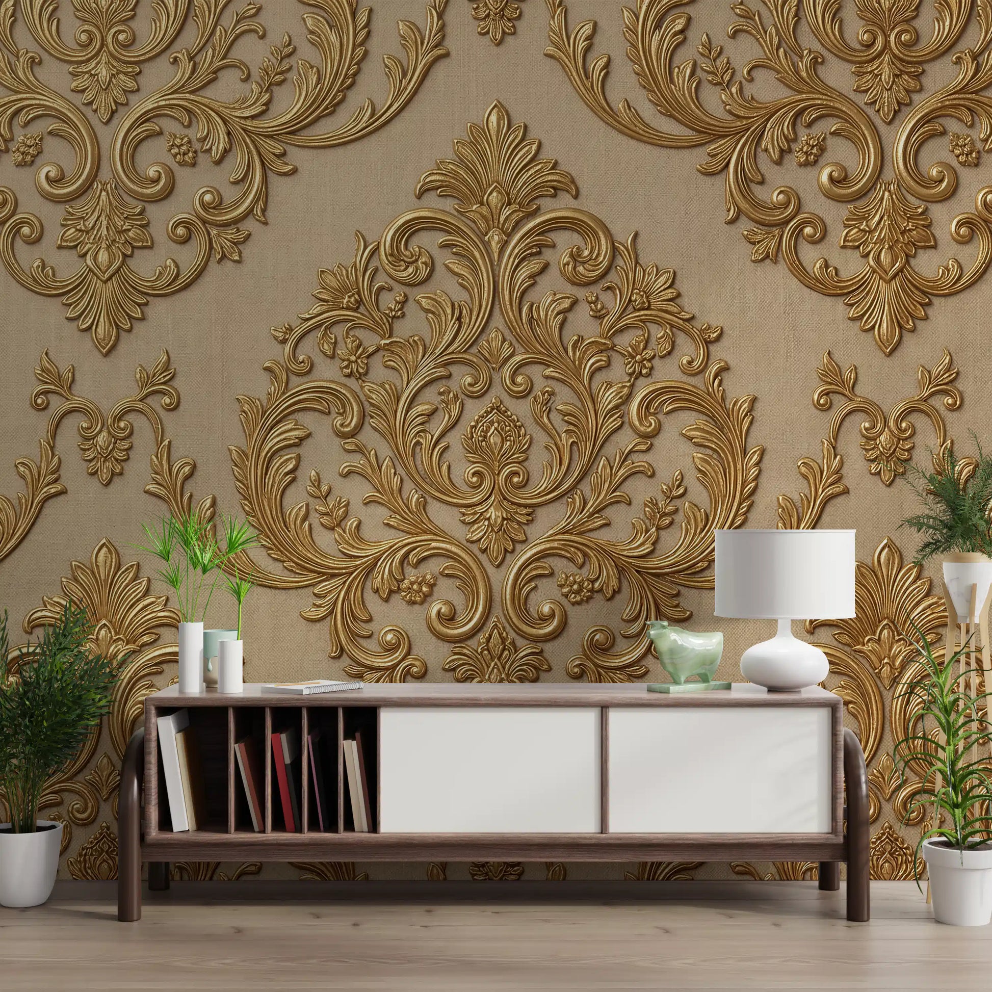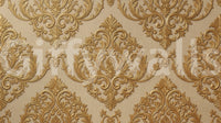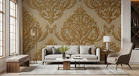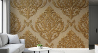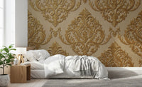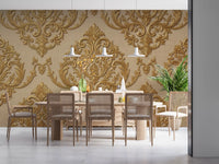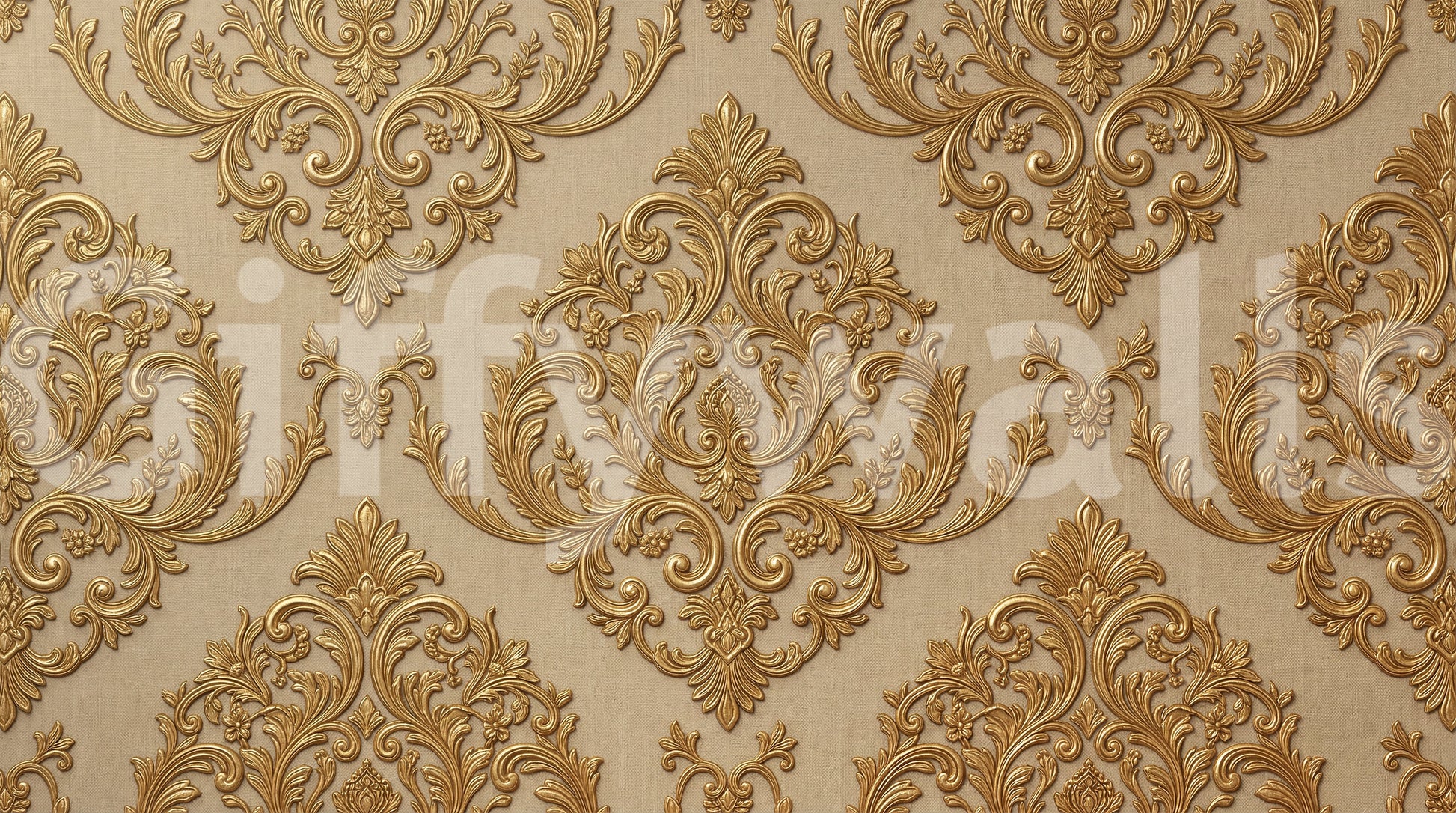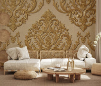 Transform your living space with this exquisite wallpaper, featuring a breathtaking display of classic elegance. Intricate golden damask and baroque scrollwork patterns unfold across a subtle, textured beige background. This design boasts a stunning three-dimensional relief, giving each ornate flourish a sculptural quality that dramatically catches the light. The rich gold palette on warm beige tones creates an atmosphere of opulent grandeur and timeless sophistication. This luxurious wall décor works perfectly in formal living rooms, elegant dining areas, stately master bedrooms, or sophisticated entryways. It enhances interior spaces by adding depth, warmth, and an inviting, distinguished character, elevating the entire room's aesthetic.