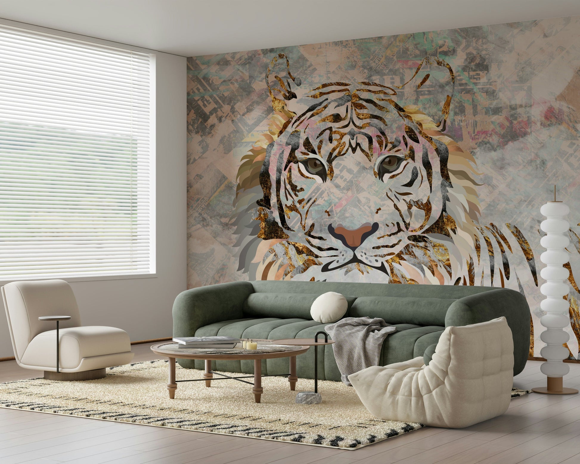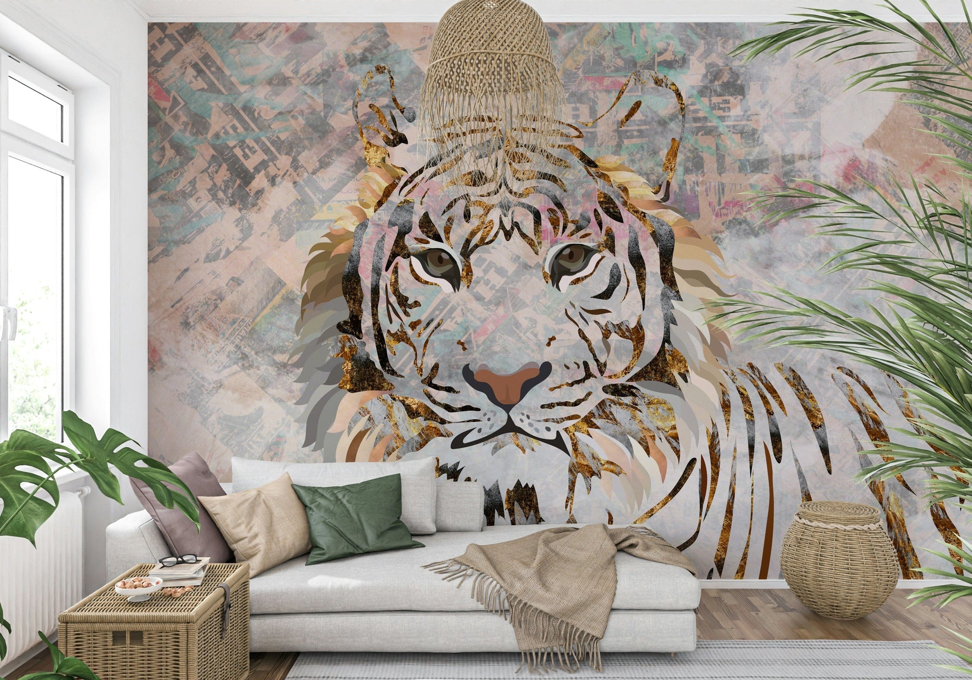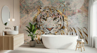 Transform your space with this unique tiger design. Featuring a striking gold leaf effect against a collage background, this wallpaper for walls adds a luxurious touch. Soft peach, grey and gold accents make it a versatile choice for living rooms or bedrooms. The design balances urban edge with animal beauty, creating a focal point that elevates decor. It offers a fusion of modern art and wildlife portraiture.