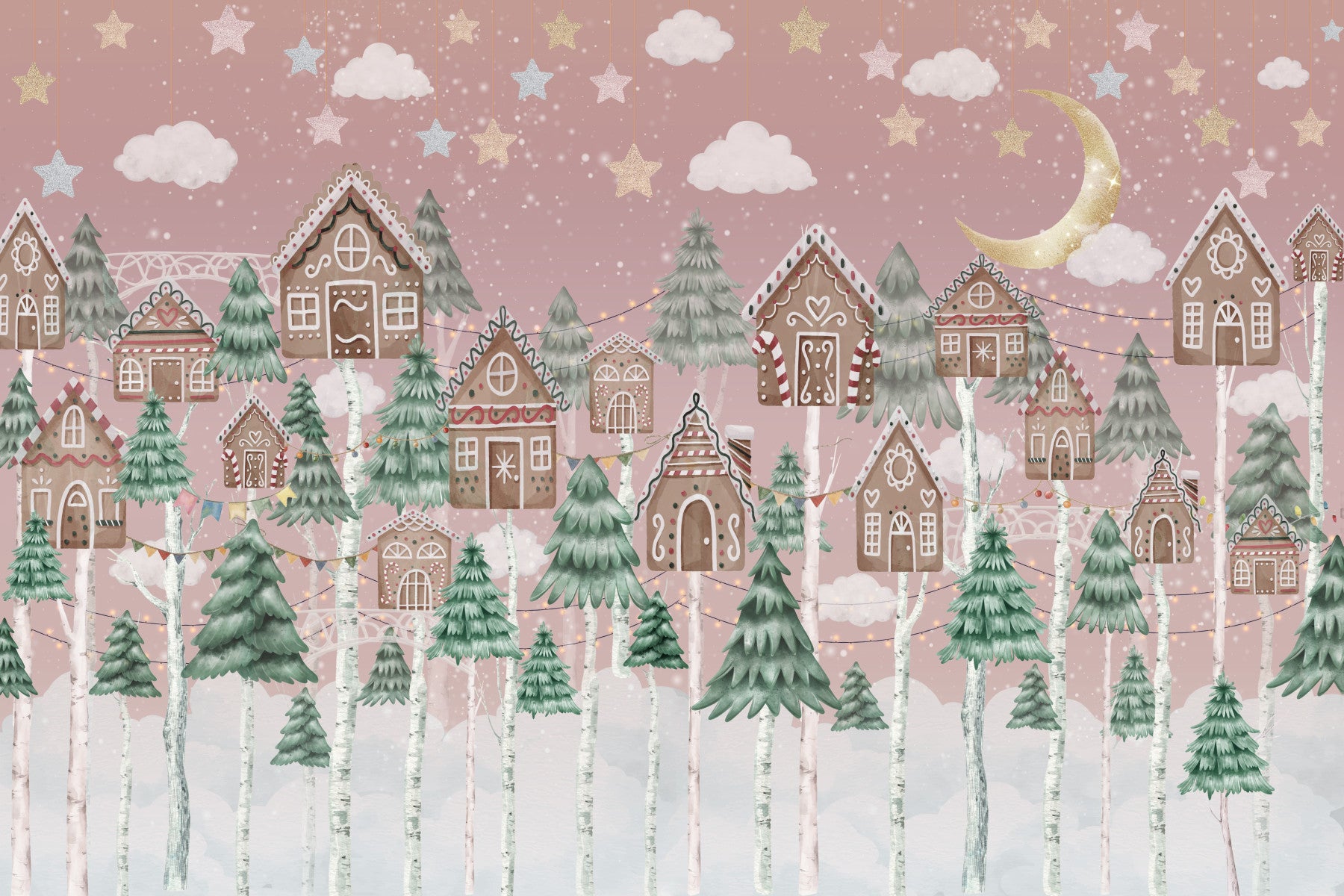 Create a heartwarming space with this charming wallpaper. The design features gingerbread houses, birch trees, and a moon against a blush pink backdrop, bringing a cosy winter ambiance. This wallpaper for walls suits a kids room, nursery, or any space needing a touch of whimsy. Let the delightful scene transform your interior into a festive haven with its soft colours and playful patterns. It easily complements Scandinavian or cottage-style interiors.