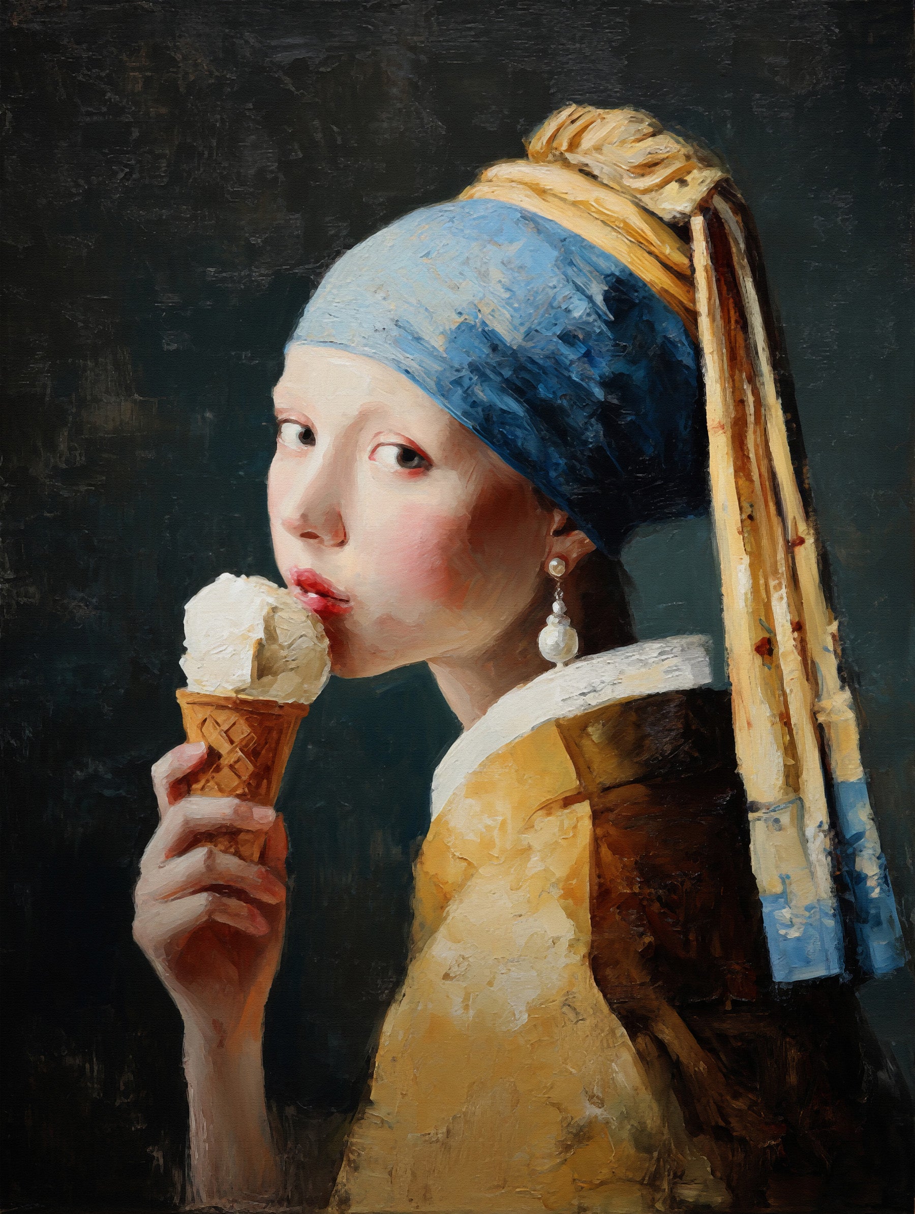 A whimsical twist on the timeless masterpiece, this artwork reimagines the famous girl with the pearl earring enjoying a creamy ice cream cone. Inspired by the Dutch Golden Age and painted in a richly textured oil style, it blends classical elegance with playful modern charm. Perfect for eclectic interiors, art lovers, and vintage-inspired wall decor, it adds both sophistication and a smile to your space. Ideal for living rooms, creative studios, or feature walls seeking a bold conversation piece.