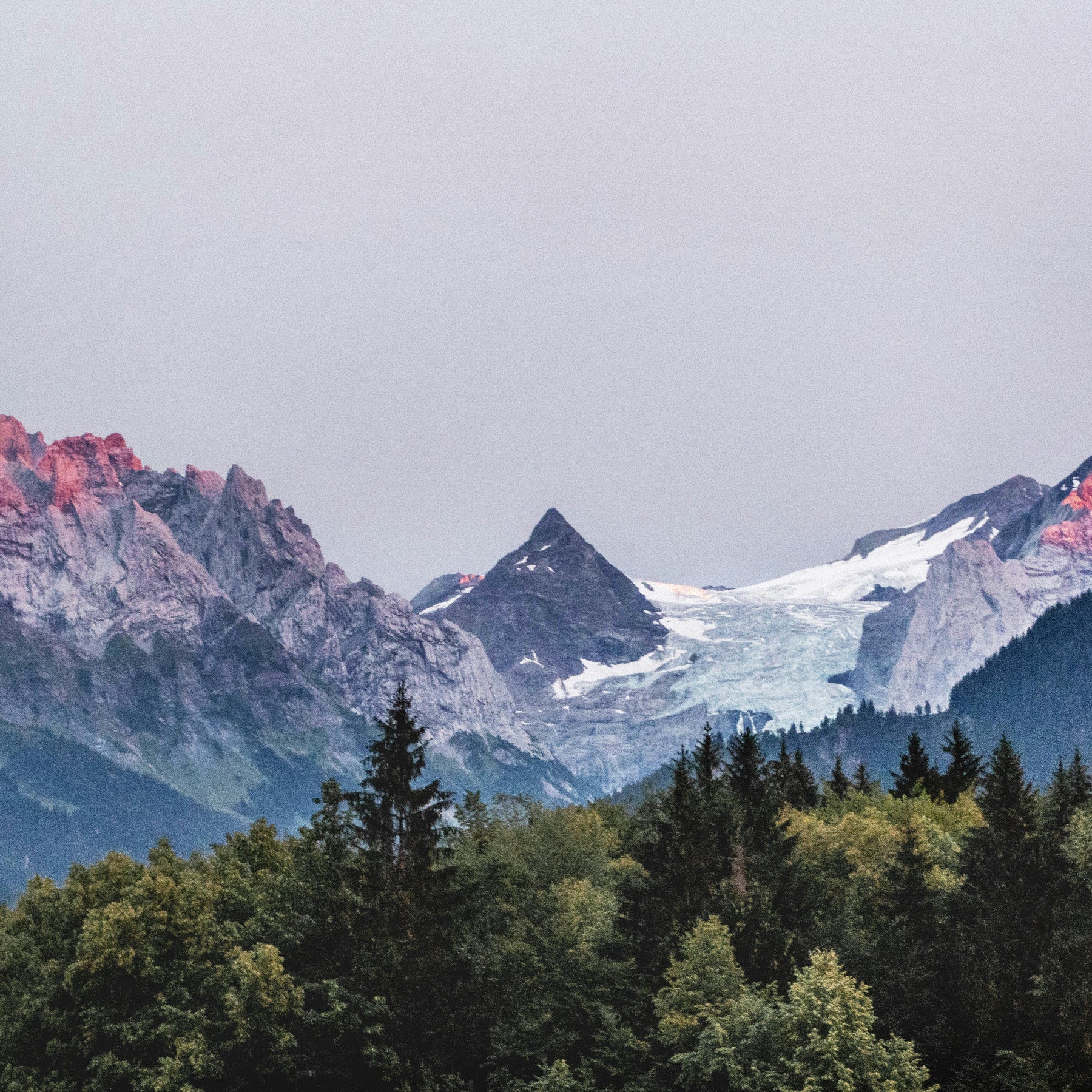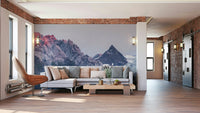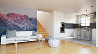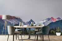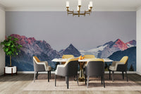 Dramatic mountain vista wallpaper featuring a glacier and the breathtaking sunset hues painting the peaks. Perfect for a modern or rustic decor style.