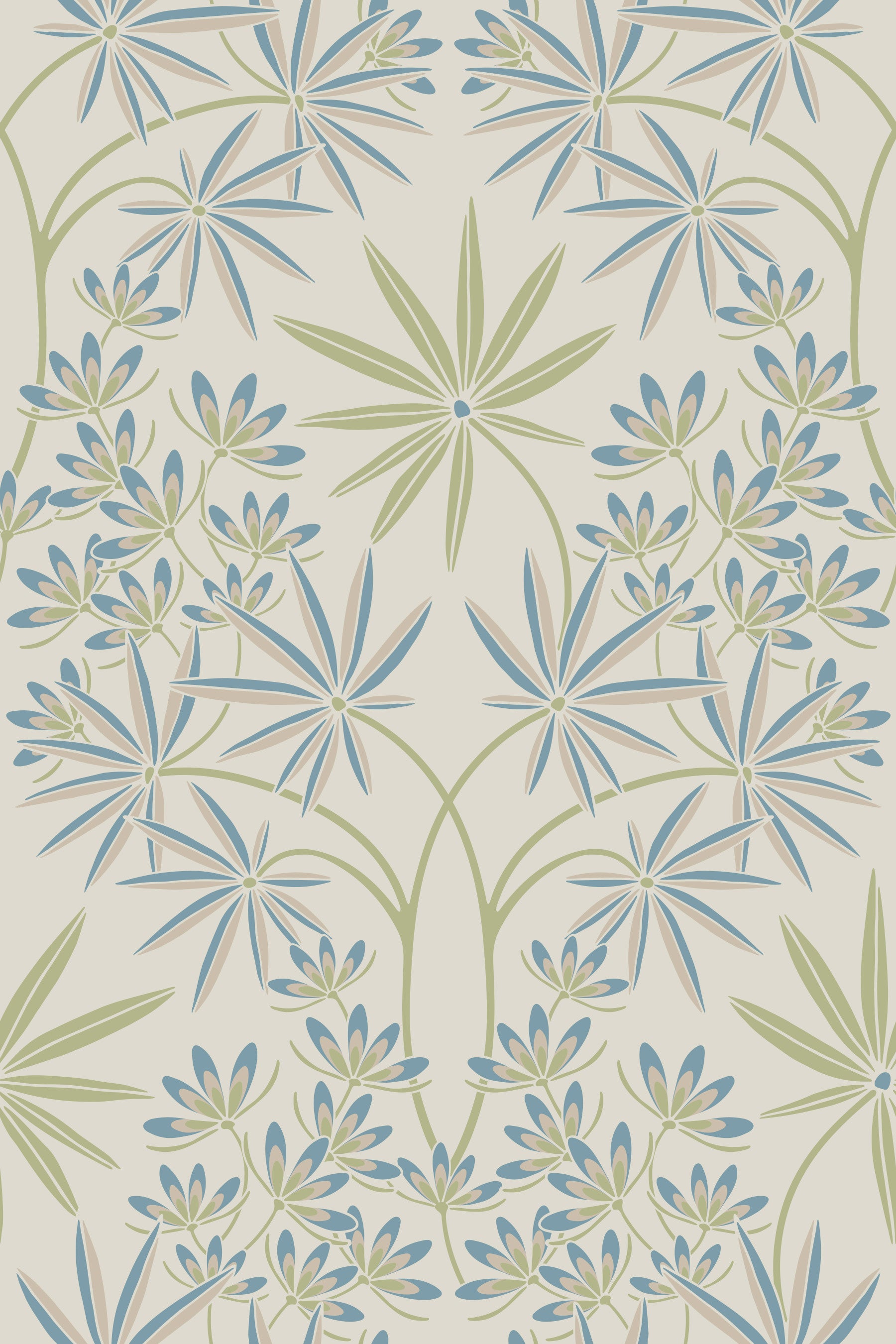 Immerse yourself in the gorgeous world of this Glamour floral damask wallpaper in a cottagecore Sage Green on Cream colourway. This floral tropical botanical pattern is an unapologetic celebration of Maximalism, referencing both Art Nouveau and opulent Jazz Age style, featuring blue and sage green flowers and tropical leaves on a cream background in a delicate lacy damask layout. The symmetrical arrangement creates a sense of formal elegance, typical of damask patterns, with an exaggerated scale and gentle cottage color palette that is perfect for adding a touch of fresh energy to any space. This pattern design is also available in Other Colourways too! Original wallpaper pattern design by Jackie Tahara of UnBlink Studio.