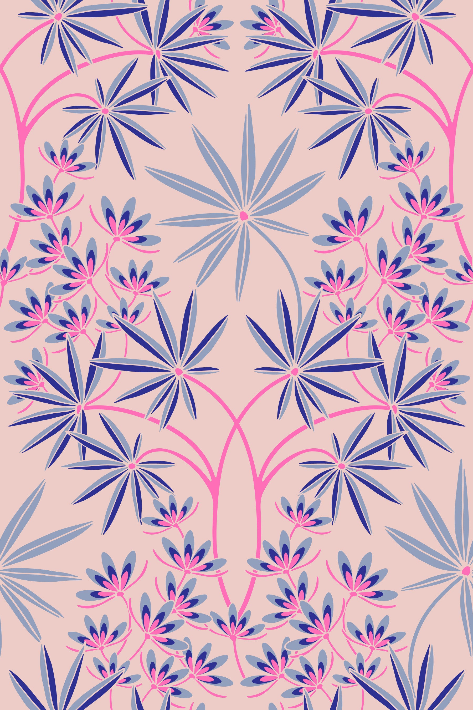 Immerse yourself in the gorgeous opulent world of this Glamour floral damask wallpaper in a Light Pink colourway reminiscent of Old Hollywood. This floral tropical botanical pattern is an unapologetic celebration of Maximalism, referencing both Art Nouveau and opulent Jazz Age style, featuring lavender purple, fuchsia hot pink and royal blue flowers and tropical leaves on a light pink background in a delicate lacy damask layout. The symmetrical arrangement creates a sense of formal elegance, typical of damask patterns, with an exaggerated scale and pretty color palette that is perfect for adding a touch of high-fashion drama to any space. This pattern design is also available in Other Colourways too! Original wallpaper pattern design by Jackie Tahara of UnBlink Studio.