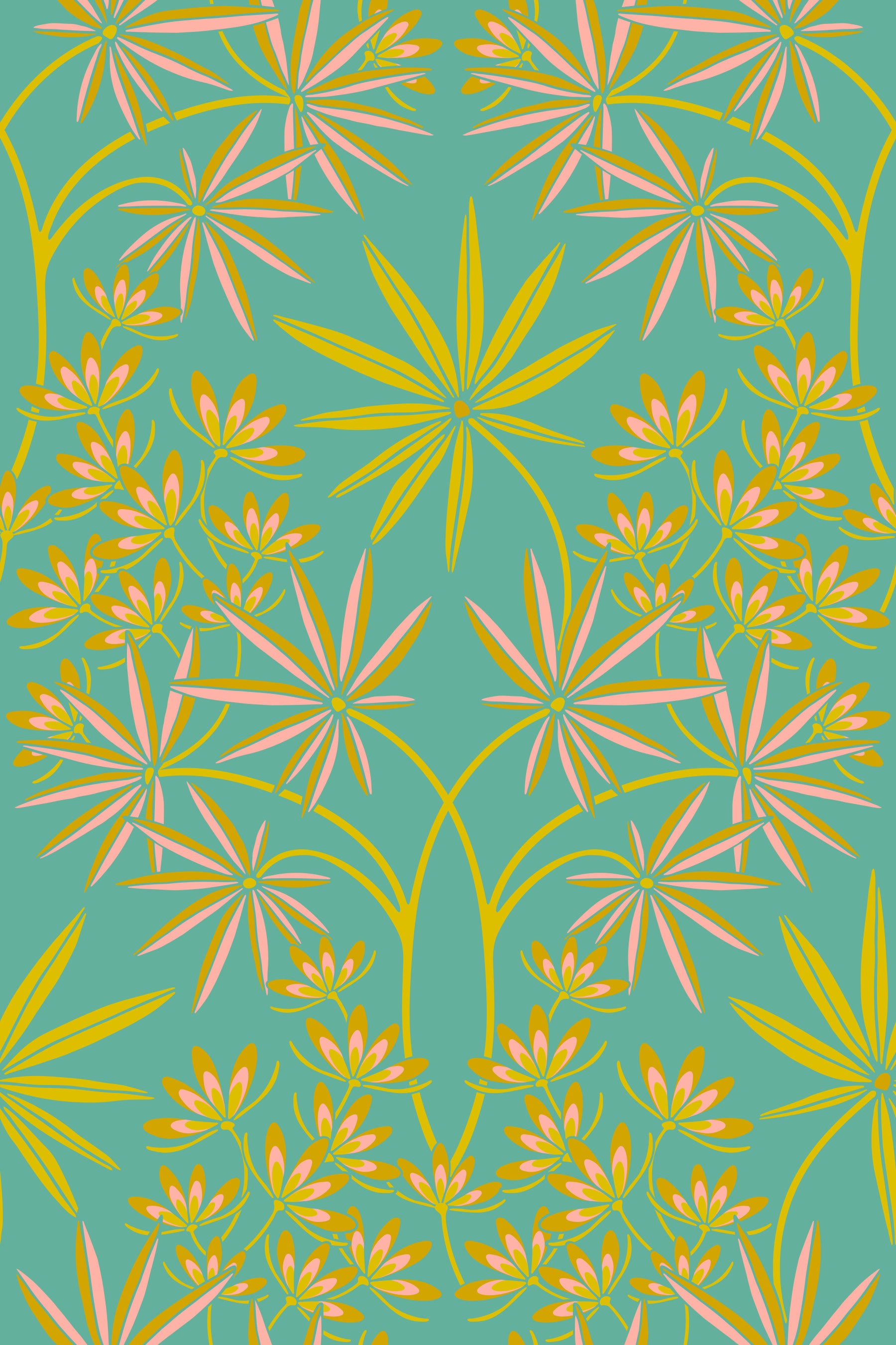 Immerse yourself in the gorgeous opulent world of this Glamour floral damask wallpaper in a Turquoise colourway reminiscent of Old Hollywood. This floral tropical botanical pattern is an unapologetic celebration of Maximalism, referencing both Art Nouveau and opulent Jazz Age style, featuring pink, deep yellow and citron on a turquoise background in a delicate lacy damask layout. The symmetrical arrangement creates a sense of formal elegance, typical of damask patterns, with an exaggerated scale and exuberant color palette that is perfect for adding a touch of high-fashion drama to any space. This pattern design is also available in Other Colourways too! Original wallpaper pattern design by Jackie Tahara of UnBlink Studio.