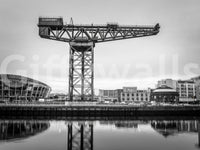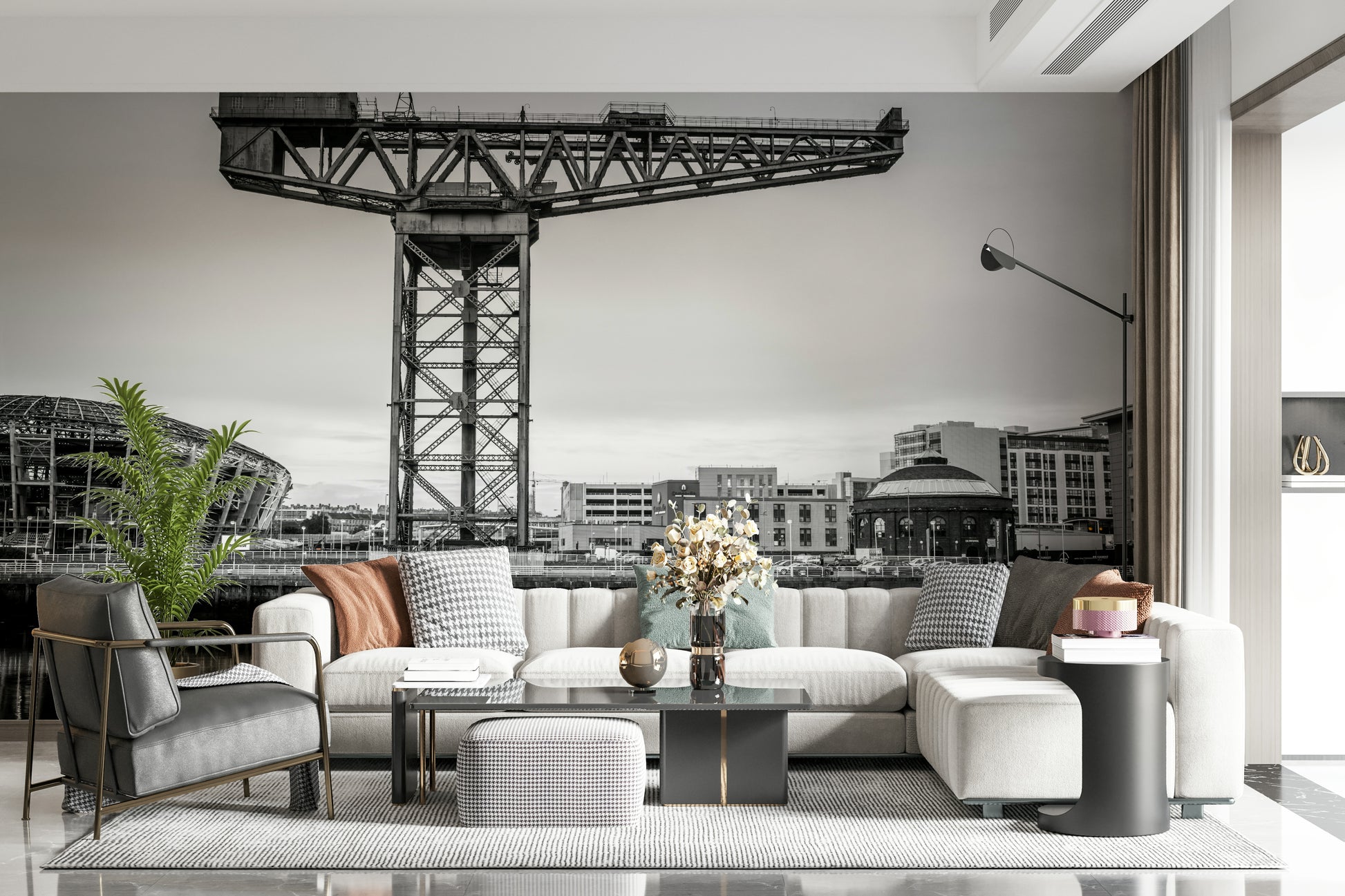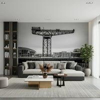 Finnieston crane on River Clyde, Glasgow. Transform your space with this industrial-inspired black and white wallpaper for walls. This design presents a stark, yet mesmerising view of the Clydeport crane, set against the backdrop of the city's buildings and water. The high-contrast image creates a focal point. The reflections on the water add depth and movement to the scene. This image works perfectly in areas like a home office, modern dining room, or studio, enhancing spaces with an urban mood. It's a statement of strength and design.