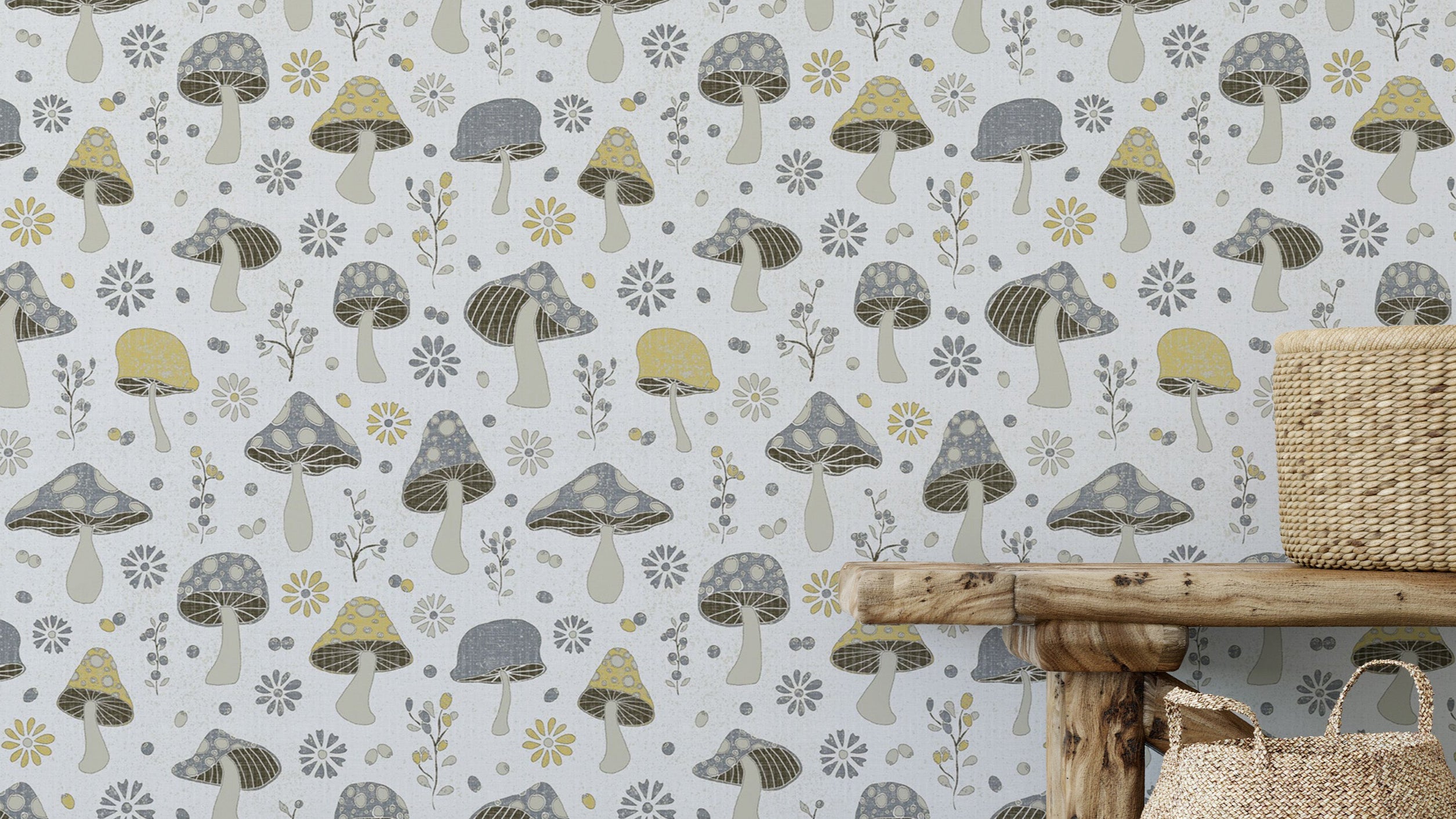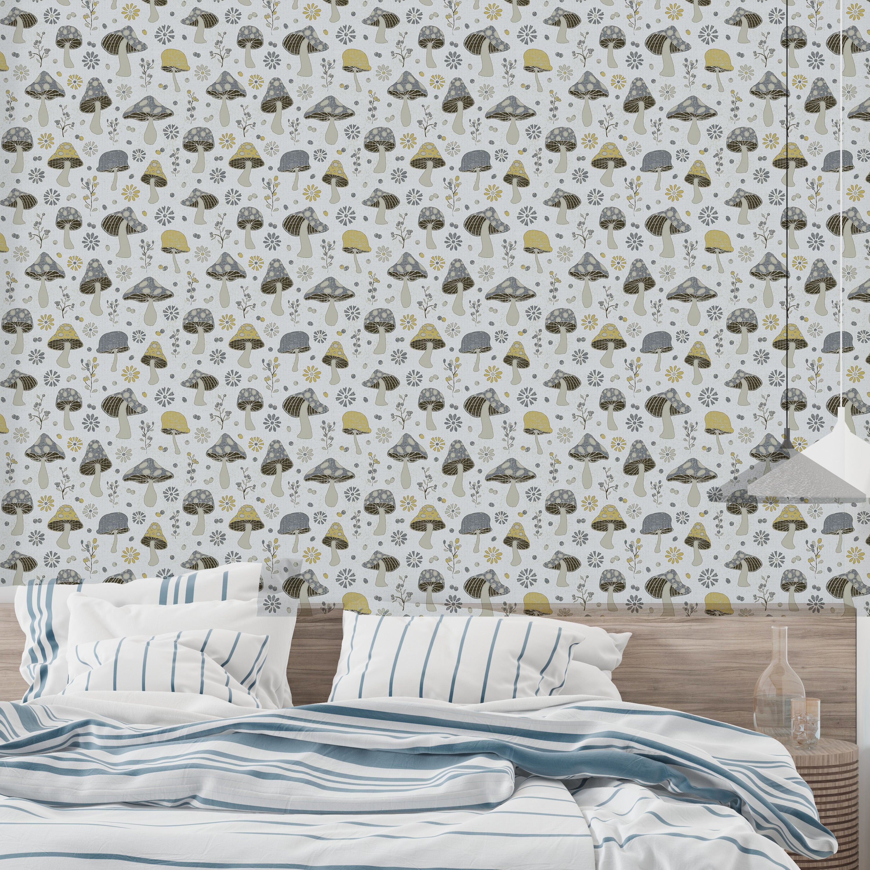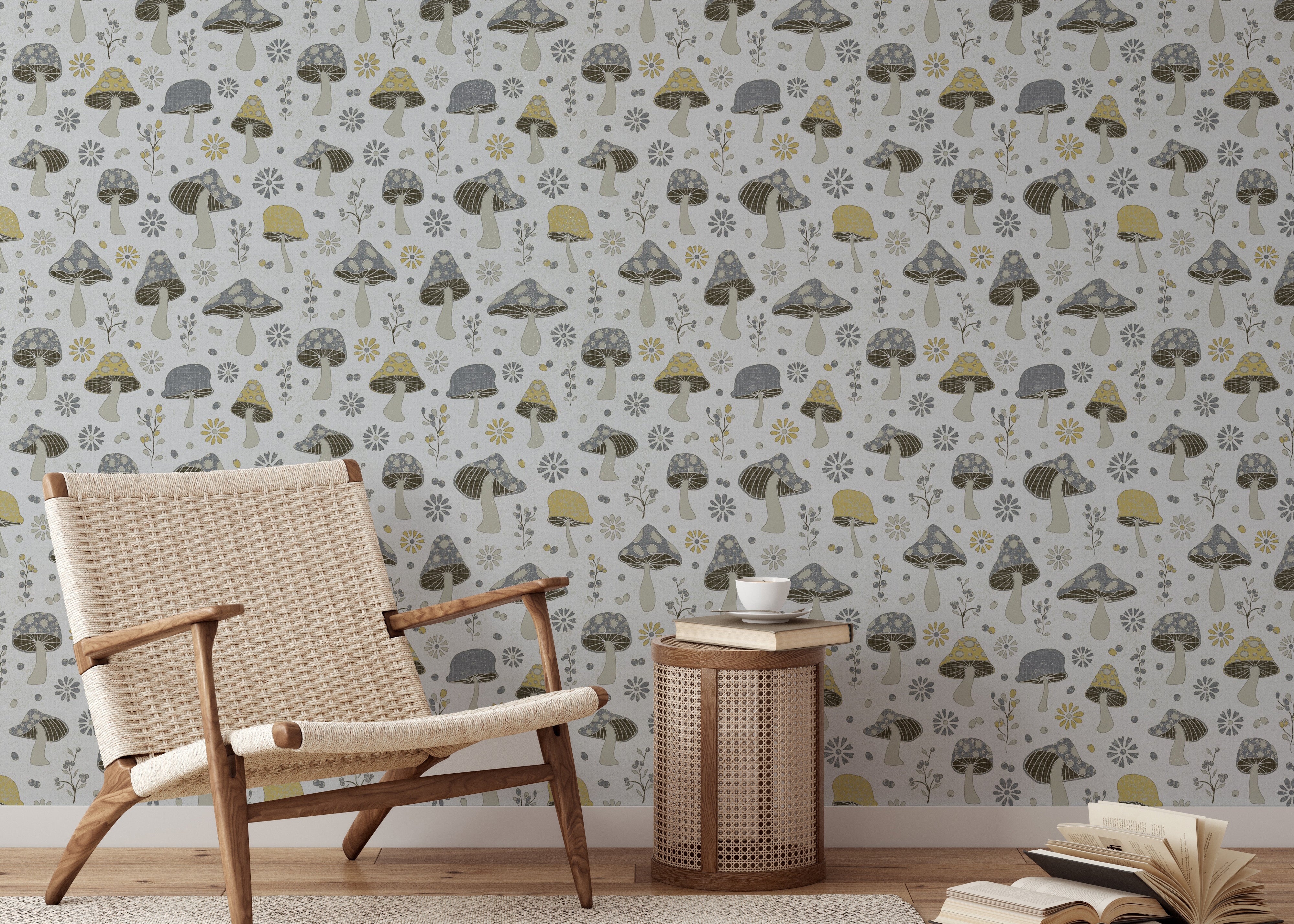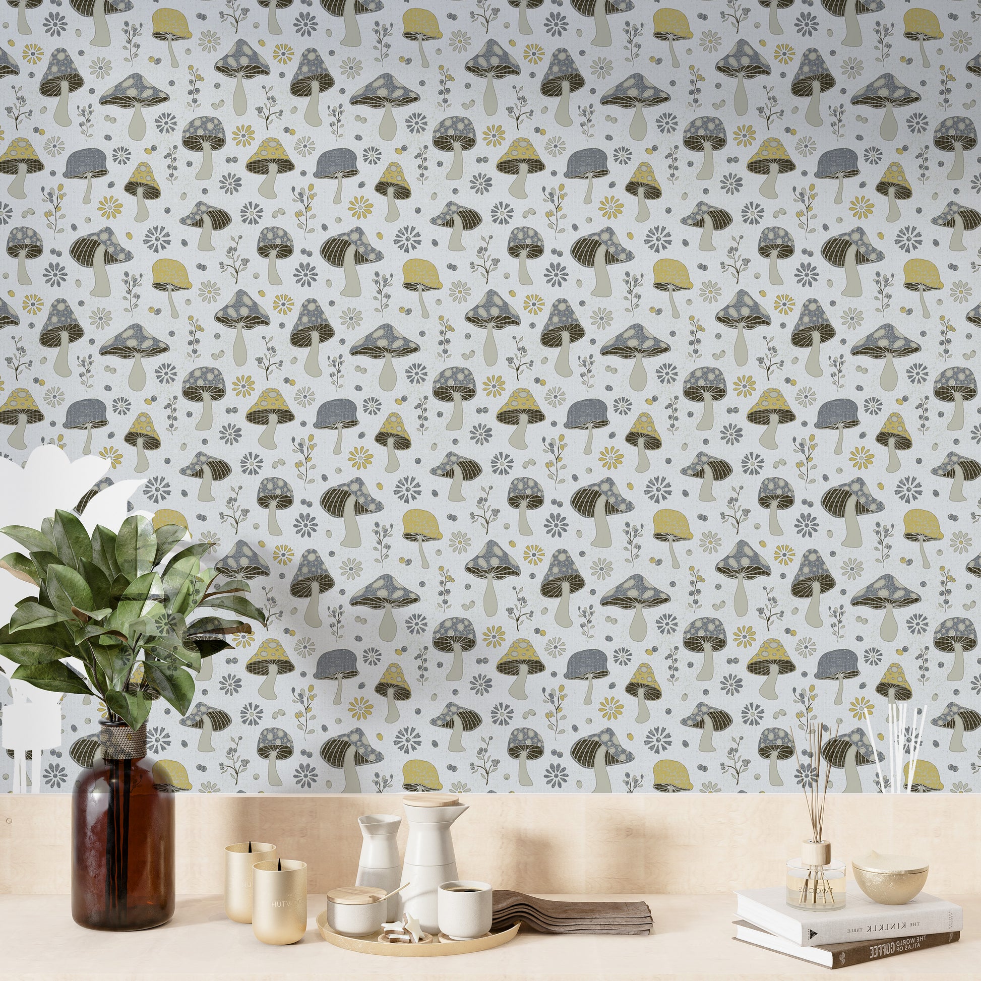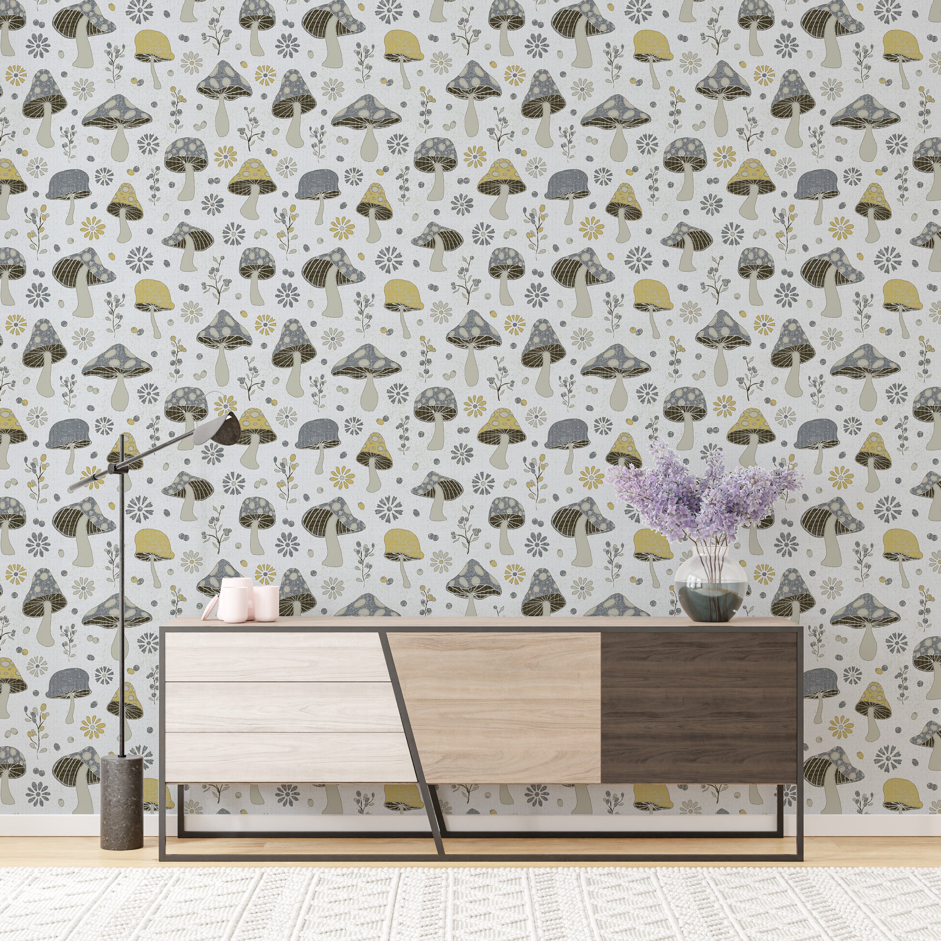 Step into an enchanted forest with the Golden and Gray Mushrooms Wallpaper. This whimsical design features a scattering of detailed mushrooms in earthy golds and subtle grays, set against a light background. Ideal for kids' rooms, cozy corners, or eclectic kitchens, it brings a storybook magic to any space. The high-quality peel-and-stick material makes for easy, mess-free decorating with a fun, organic twist.