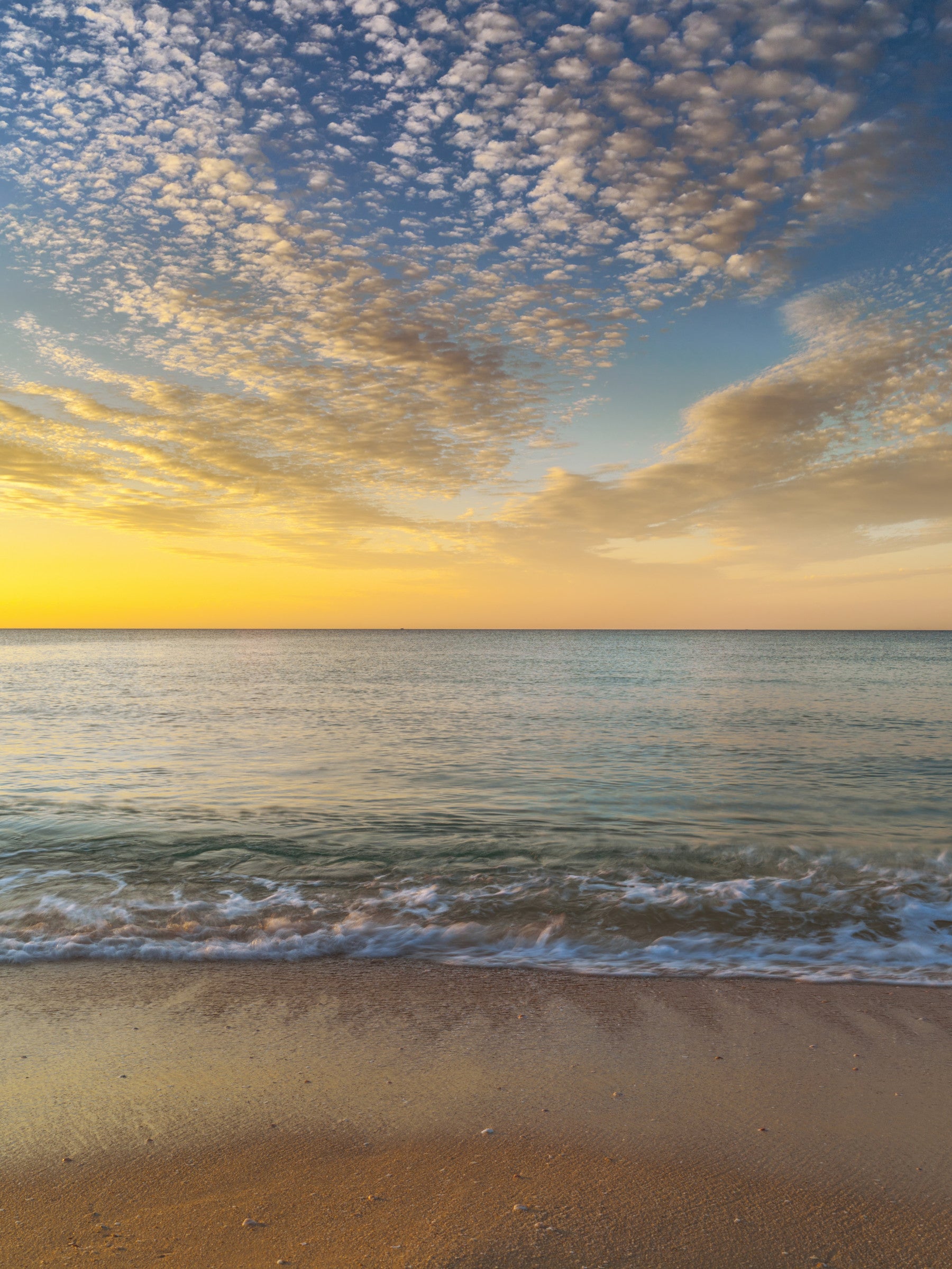 Breathe tranquility into your space with Golden Beach Sunrise Wall Mural. This vista captures the serene moments of dawn, where a radiant sun paints the sky in hues of gold and amber. The soft, textured clouds seem to dance in the awakening light, casting a warm glow over the tranquil sea below. Gentle waves kiss the sandy shore, creating a peaceful rhythm that invites relaxation. The colors blend seamlessly, from the golden sky to the turquoise sea, creating a visual symphony that brings the calm of a seaside escape into your environment. Immerse yourself in the beauty of nature's awakening, and let this scene infuse your space with serenity and the promise of a new day.