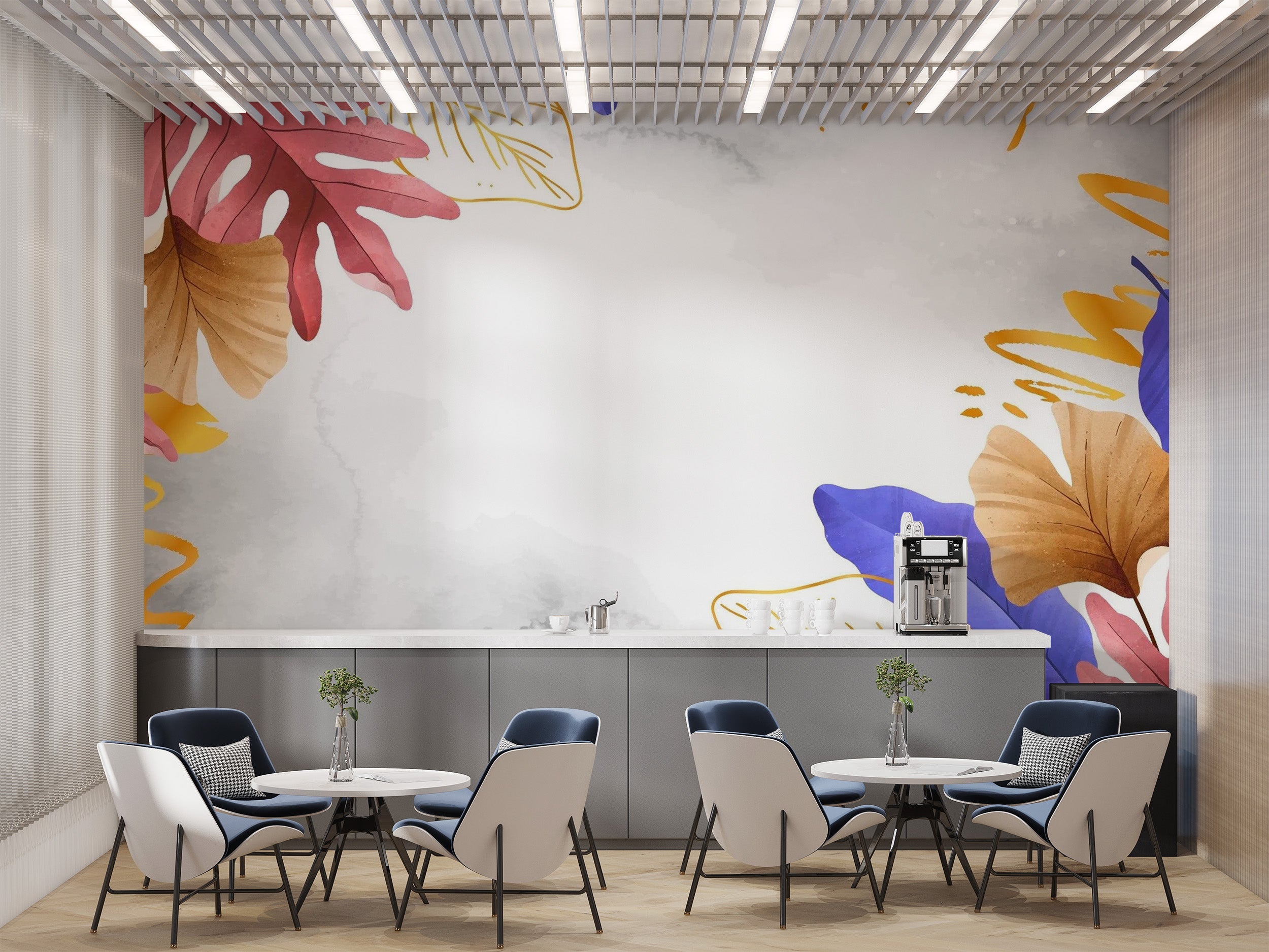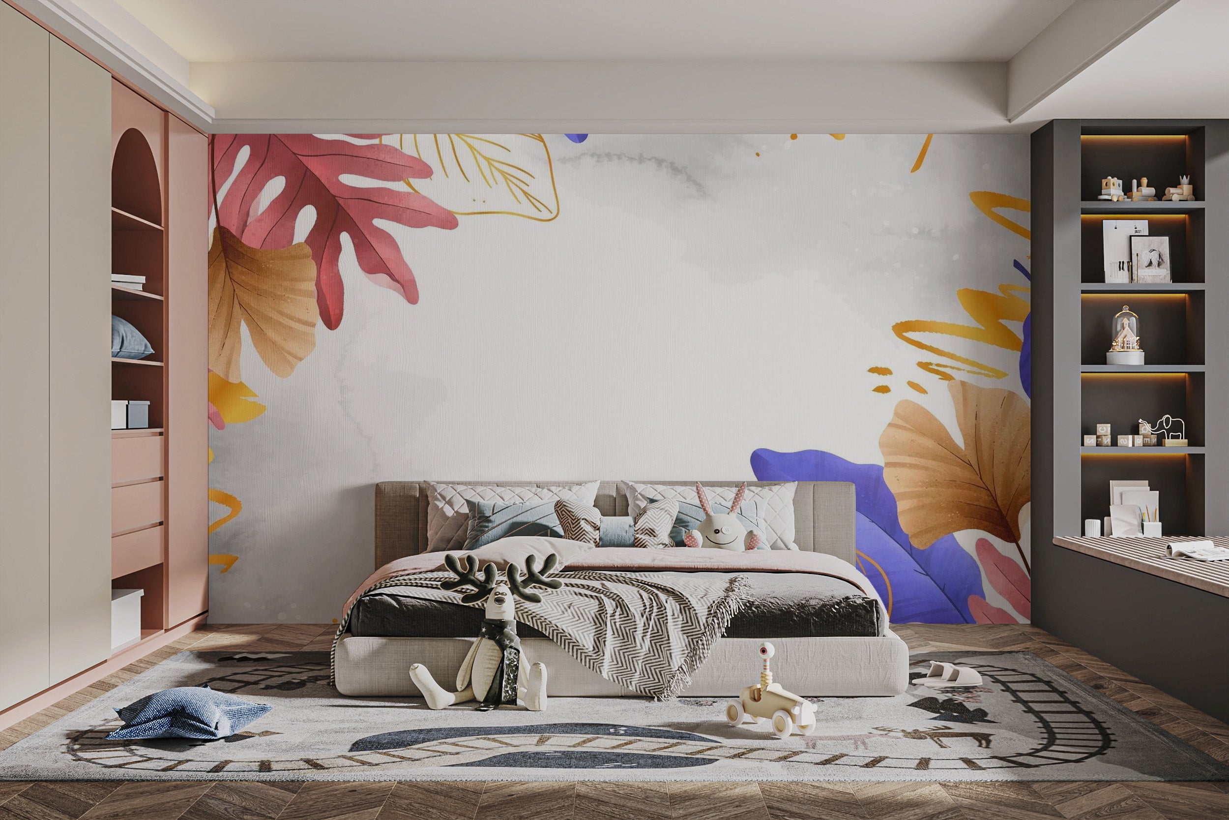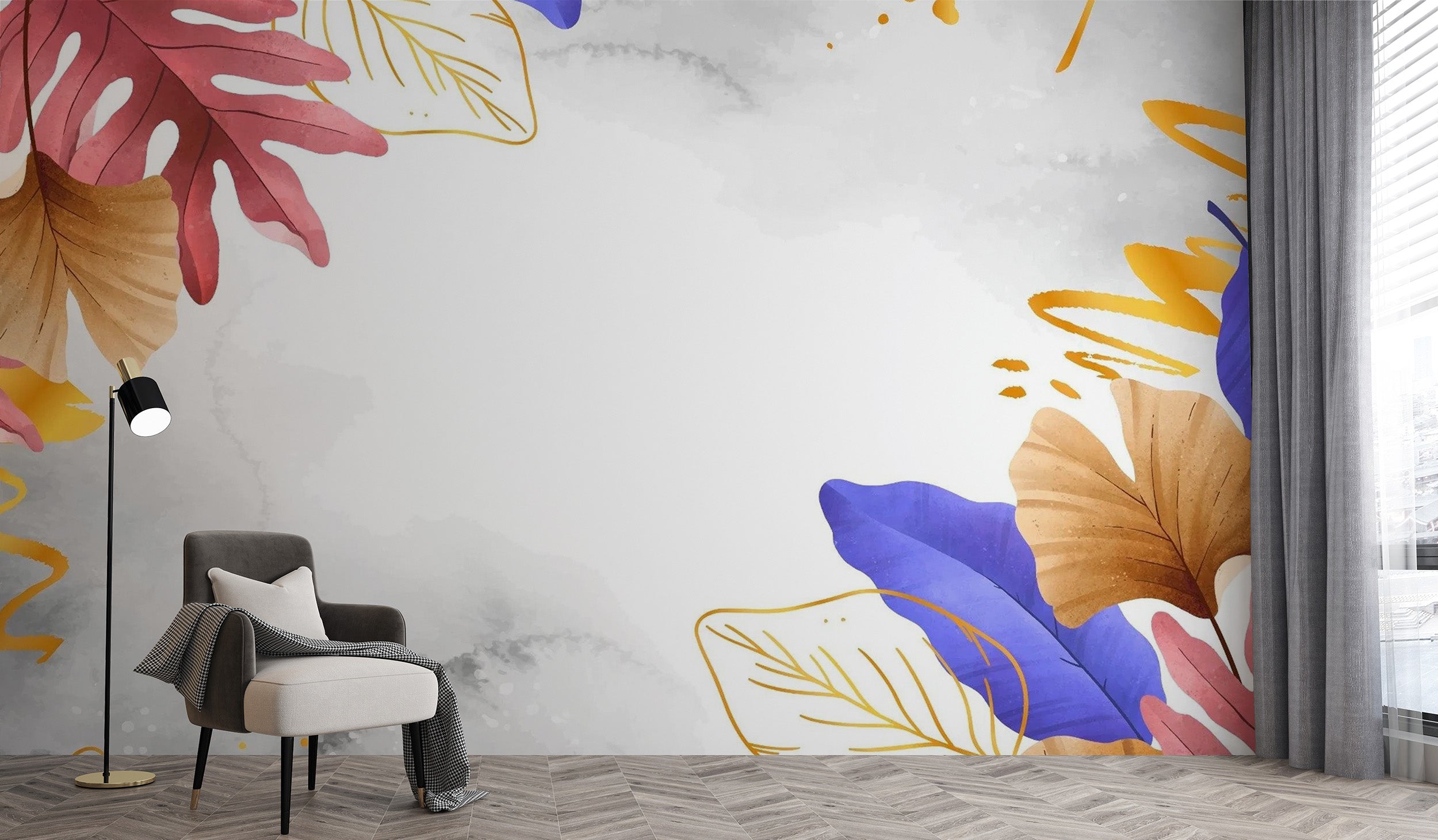 Immerse yourself in the enchanting world of the golden blue and pink leaves wallpaper, a magical creation that transforms your space into a realm of elegance and charm. This captivating mural, adorned with oversized leaves in vivid red, blue, and pink hues, captures the essence of a mystical forest. The leaves, artistically scattered across the canvas, create a mesmerizing effect, drawing the eye and igniting the imagination.