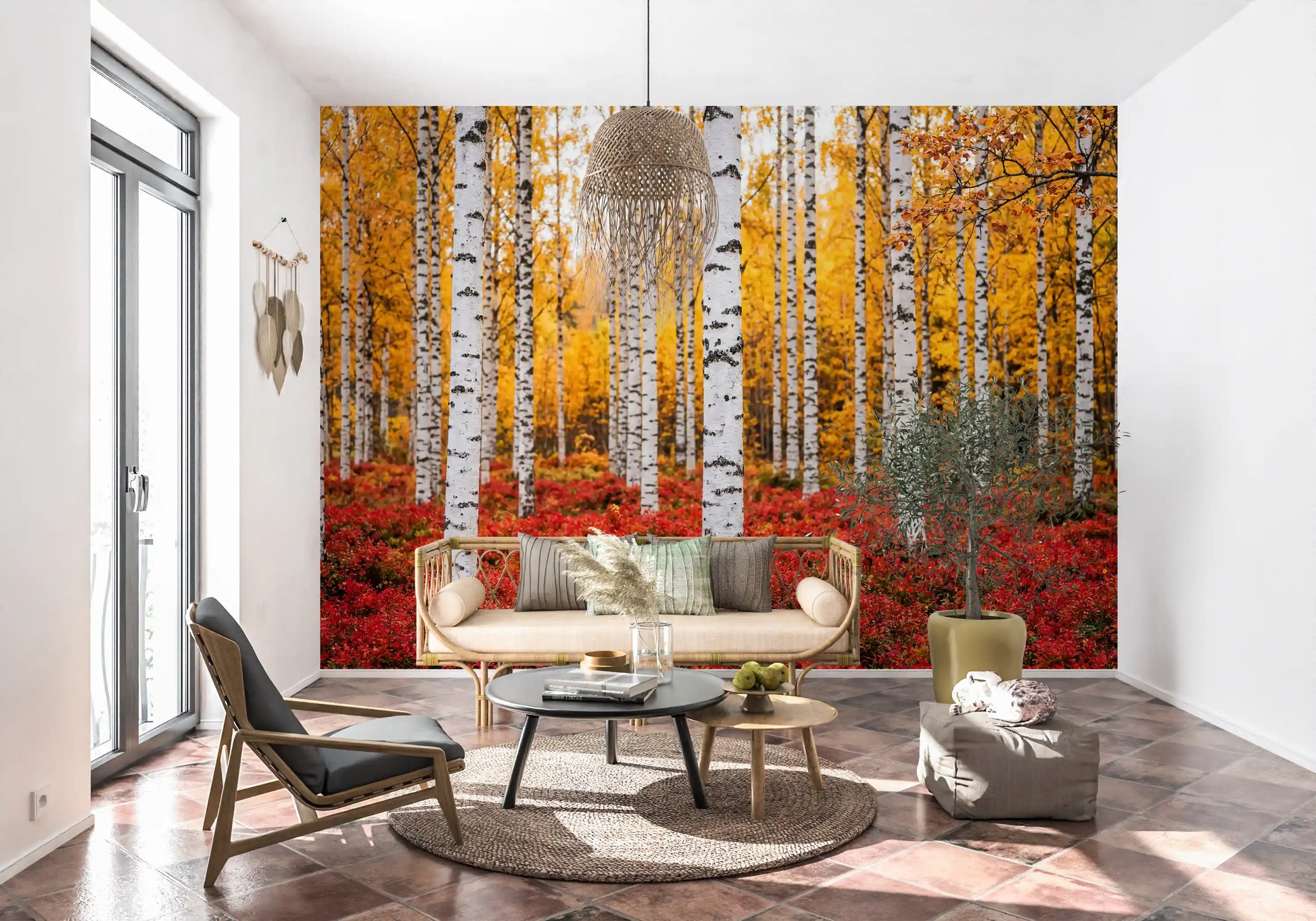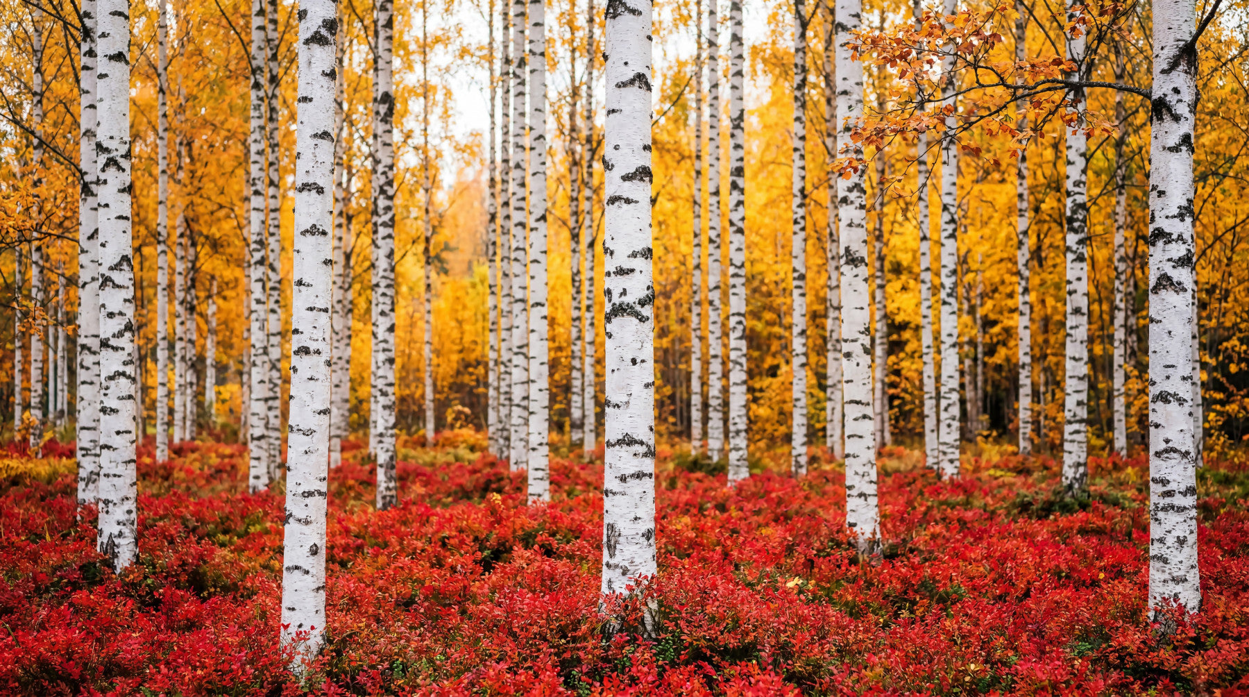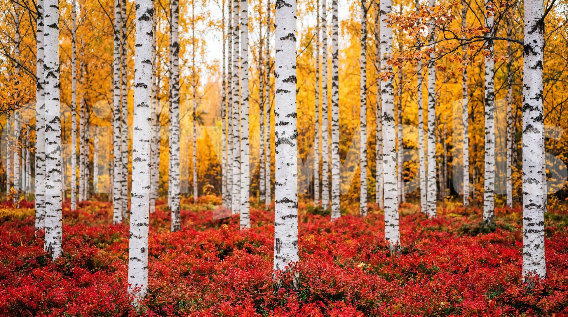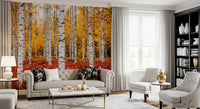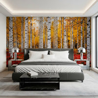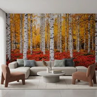 This captivating wallpaper transforms any room into a tranquil autumn forest retreat. Tall, striking white birch trunks, accented with natural black markings, create a bold vertical rhythm. Behind them, a luminous canopy of golden-yellow leaves radiates warmth and depth. At the base, a rich, fiery red undergrowth provides a stunning contrast, grounding the vibrant scene. This design elevates living rooms, bedrooms, or dining areas, introducing a serene natural vista and a touch of modern rustic elegance. It provides a focal point, infusing spaces with the breathtaking beauty and rich palette of the autumn season, creating an inviting and inspiring atmosphere.
