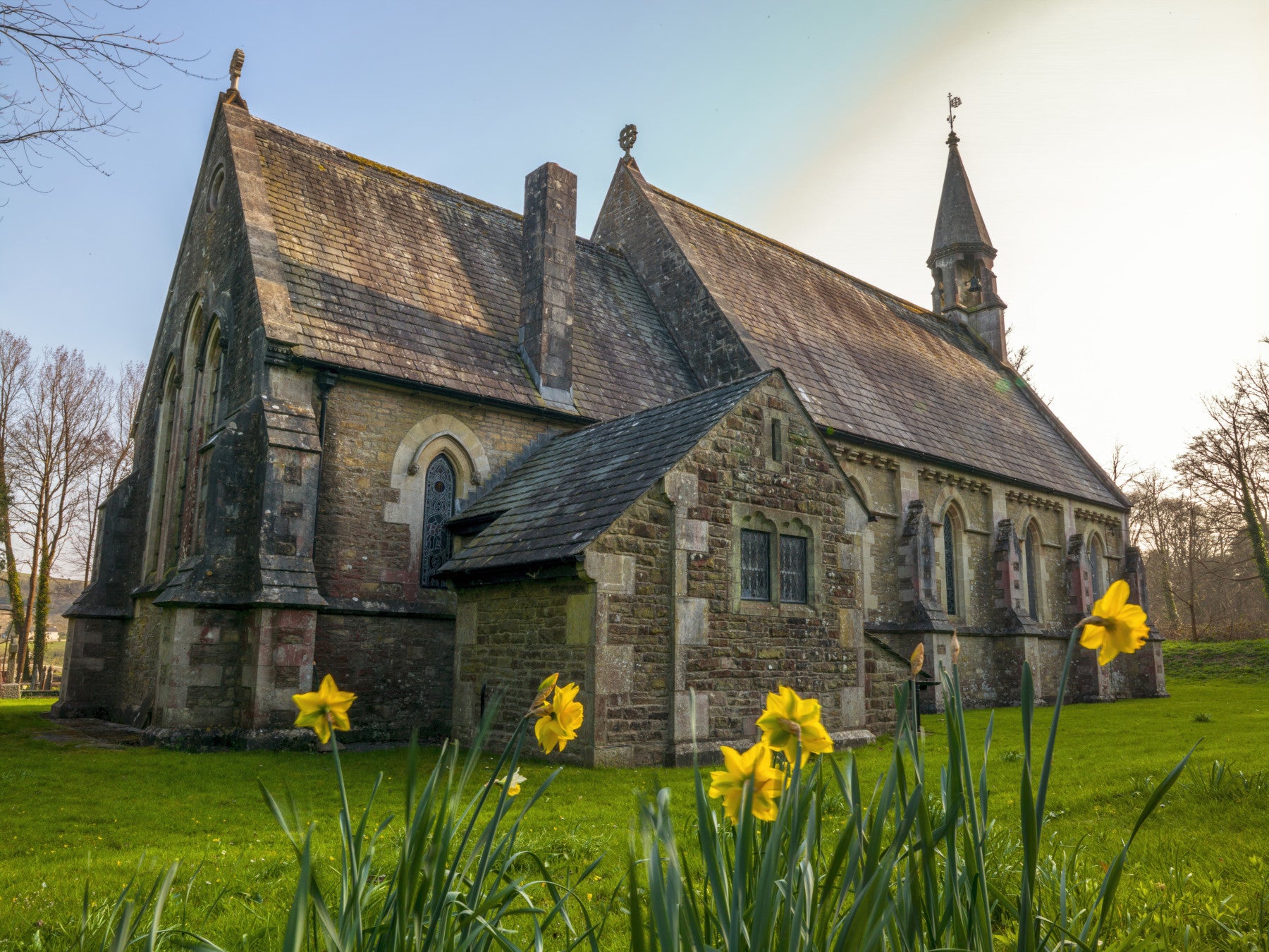 Easter Daffodils. Elevate the look of your interiors with this design. It shows a stately stone church, softened by golden daffodils. The colour palette features yellow, brown, and green. This photograph provides a serene mood to any room. As wallpaper for walls, this design is well-suited for a dining room, living room, or entry. It complements interiors seeking a balance of architectural interest with a natural touch. The image makes a stunning statement, creating a tranquil backdrop.
