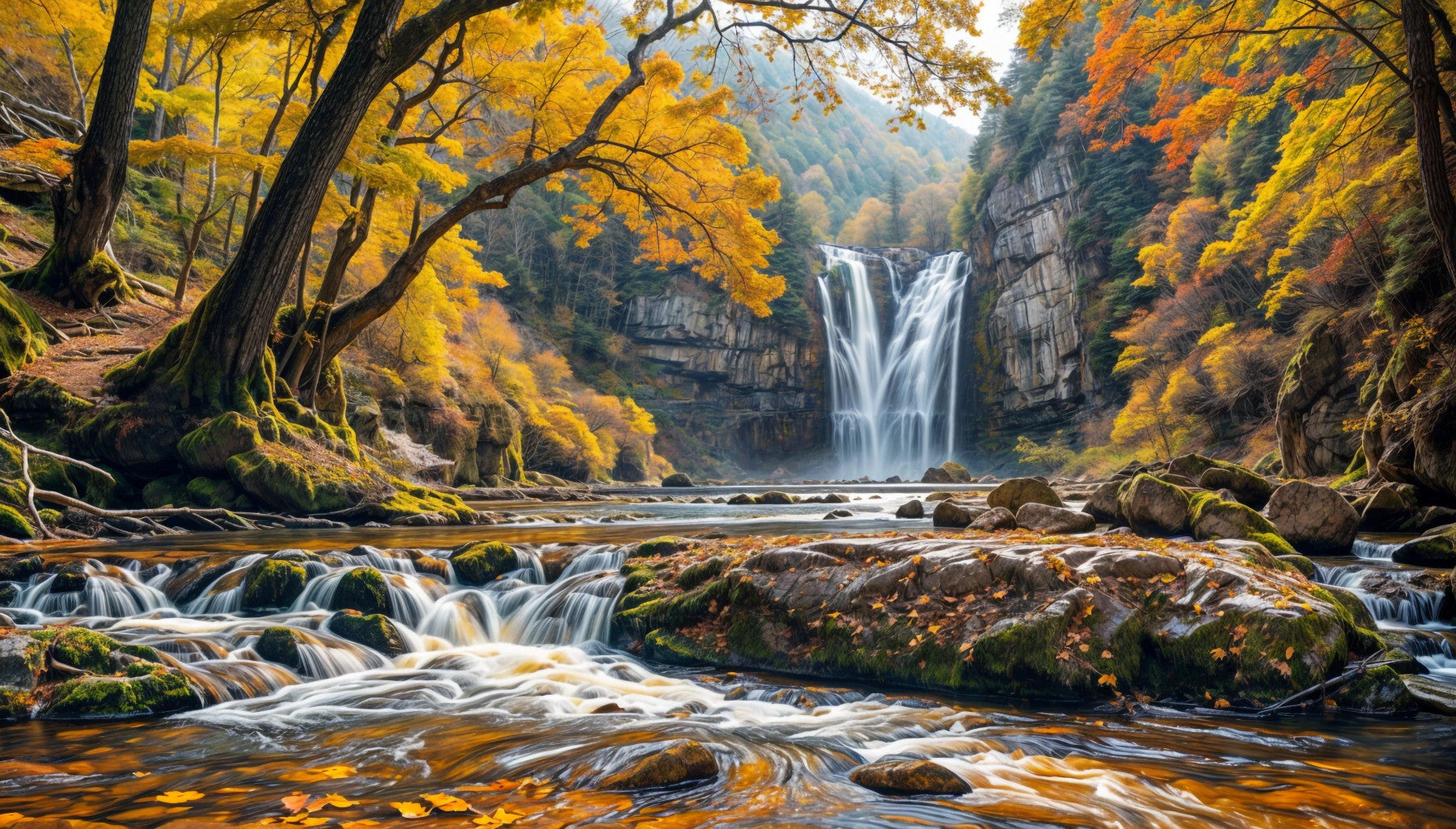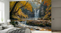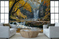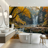 Elevate your interior design with this picturesque wallpaper for walls. A majestic waterfall is framed by trees showcasing the vibrant colours of autumn. The rich palette, dominated by golden yellows, warm browns, and deep greens, brings the beauty of autumn indoors. Ideal for living rooms, dining rooms, or bedrooms, this wall décor establishes a serene and sophisticated atmosphere. Imagine the calming effect of the cascading water and the warmth of the autumnal tones enhancing your interior spaces. Let this design add a touch of natural elegance to your home.