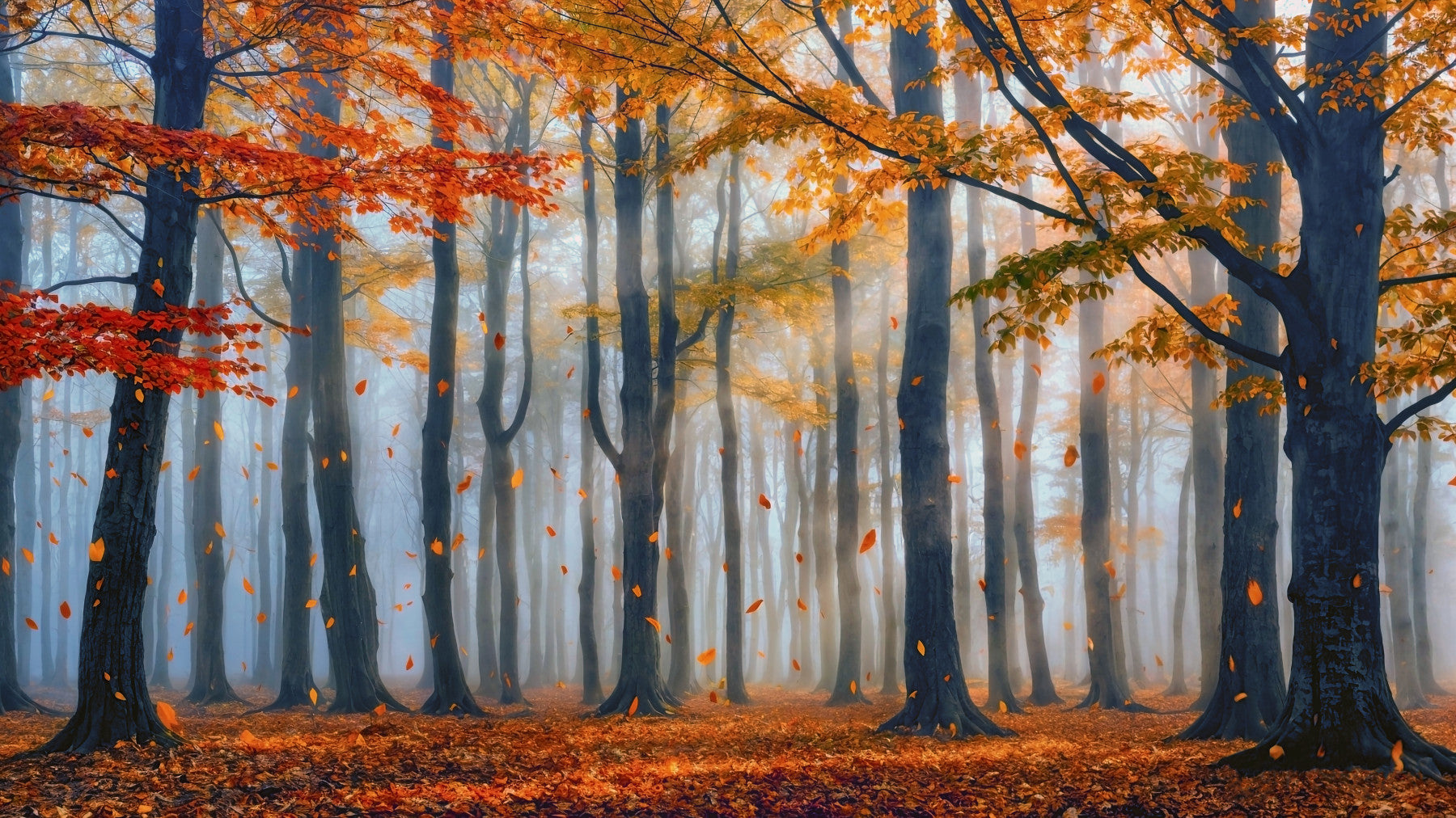 Immerse yourself in a scene of natural beauty with this captivating wallpaper for walls. Tall trees stand in a dreamy autumn landscape, with golden leaves adding warmth. The fog lends a touch of mystery. The color palette of orange, yellow, and blue brings a sophisticated feel. This design would suit a living room or bedroom, adding serenity and style to interior spaces.