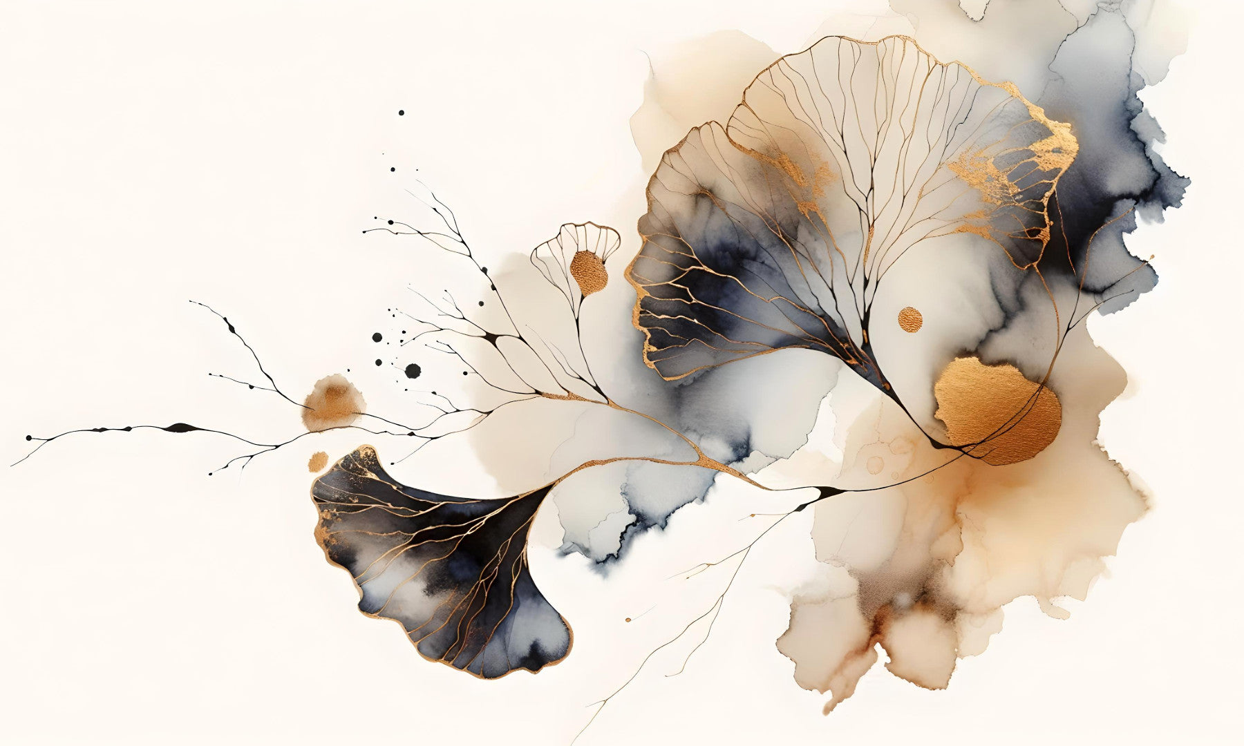 This abstract watercolor wallpaper features ethereal ginkgo leaves rendered in shades of deep grey and black, delicately accented with gold leaf. The organic shapes and flowing lines create a sense of calm and serenity, while the gold adds a touch of luxury. The design is both modern and timeless, perfect for adding a sophisticated touch to any room in your home. The subtle color palette, primarily composed of neutral tones with hints of gold, makes it a versatile choice for various interior design styles. It evokes a feeling of quiet contemplation and peaceful elegance, making it ideal for spaces designed for relaxation or mindfulness.
