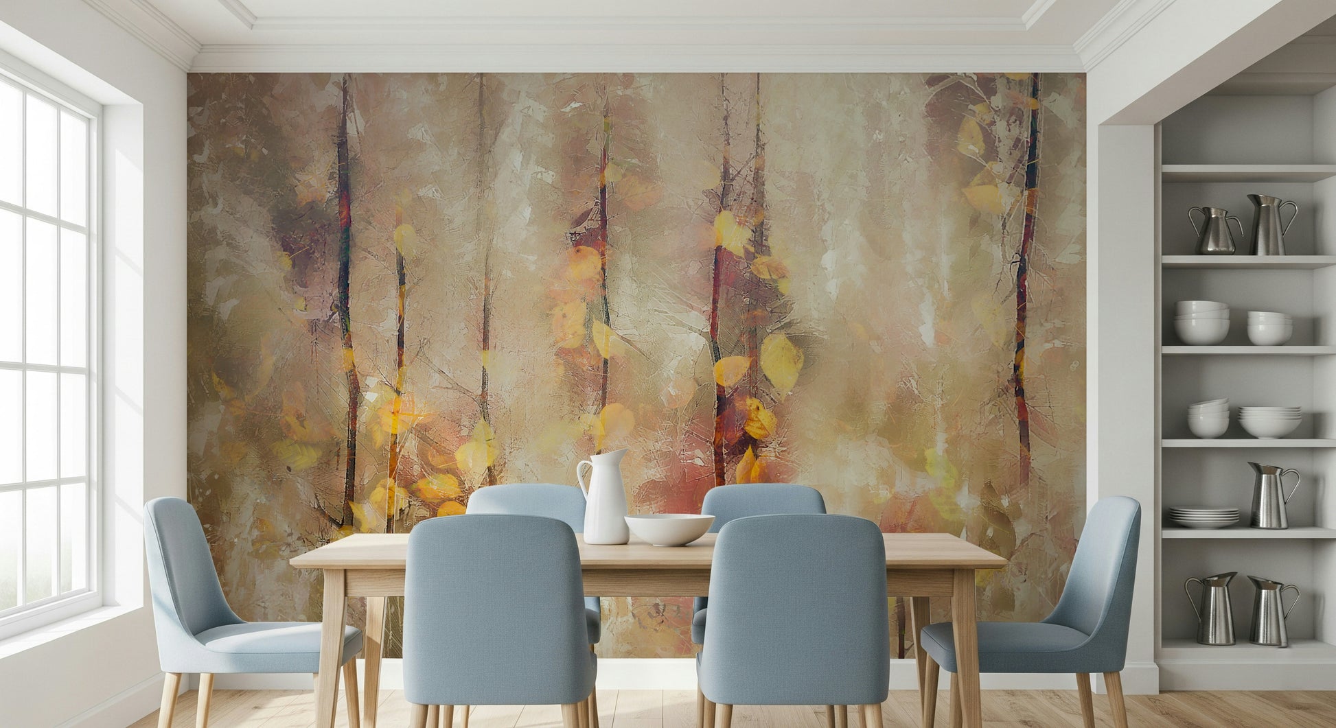 Bring a soft, artistic touch to your walls with this botanical-inspired design. The abstract forest scene features delicate trees and hints of yellow leaves. This wallpaper for walls offers a tranquil setting, ideal for the bedroom or living area. Beige, brown, and touches of gold blend to create a warm feel. This design easily enhances modern, minimalist, or even rustic spaces. It adds visual texture without overwhelming your decor.