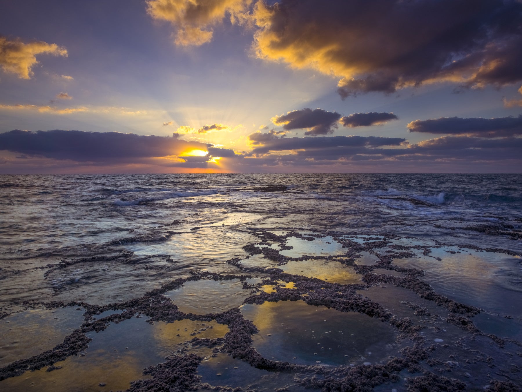 Evening view of tranquil beach. This stunning wallpaper captures the fleeting beauty of the golden hour at the shore. The sun, partially hidden behind dramatic clouds, casts a breathtaking array of warm colors across the sky and sea. The foreground is dominated by a series of tide pools, their surfaces mirroring the vibrant sunset. This creates a captivating scene full of texture and color, perfect for adding a calming yet invigorating feel to any room. The image's captivating beauty evokes a sense of peace, wonder, and the captivating power of nature.