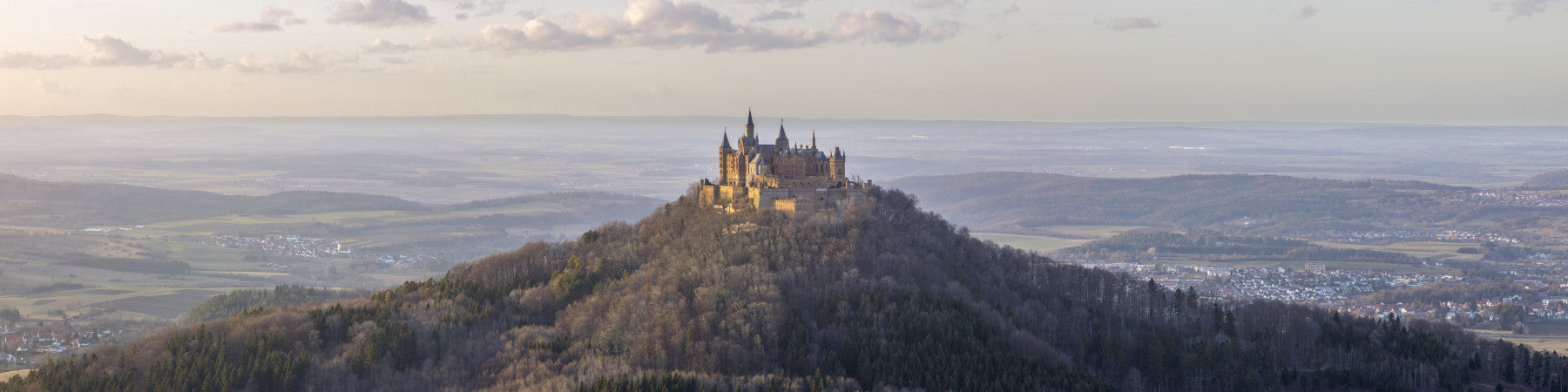 Hohenzollern Castle, Germany. Adorn your walls with a breathtaking vista. This wallpaper for walls captures a dramatic citadel illuminated by the golden hour's warm embrace. The castle dominates the view, a testament to human ingenuity nestled into a vast landscape. Earthy tones of gold, beige, and deep brown create a sense of grandeur and serenity. This design works wonders in living rooms, studies, or bedrooms, offering a sense of adventure and old-world elegance that elevates traditional and contemporary interiors.