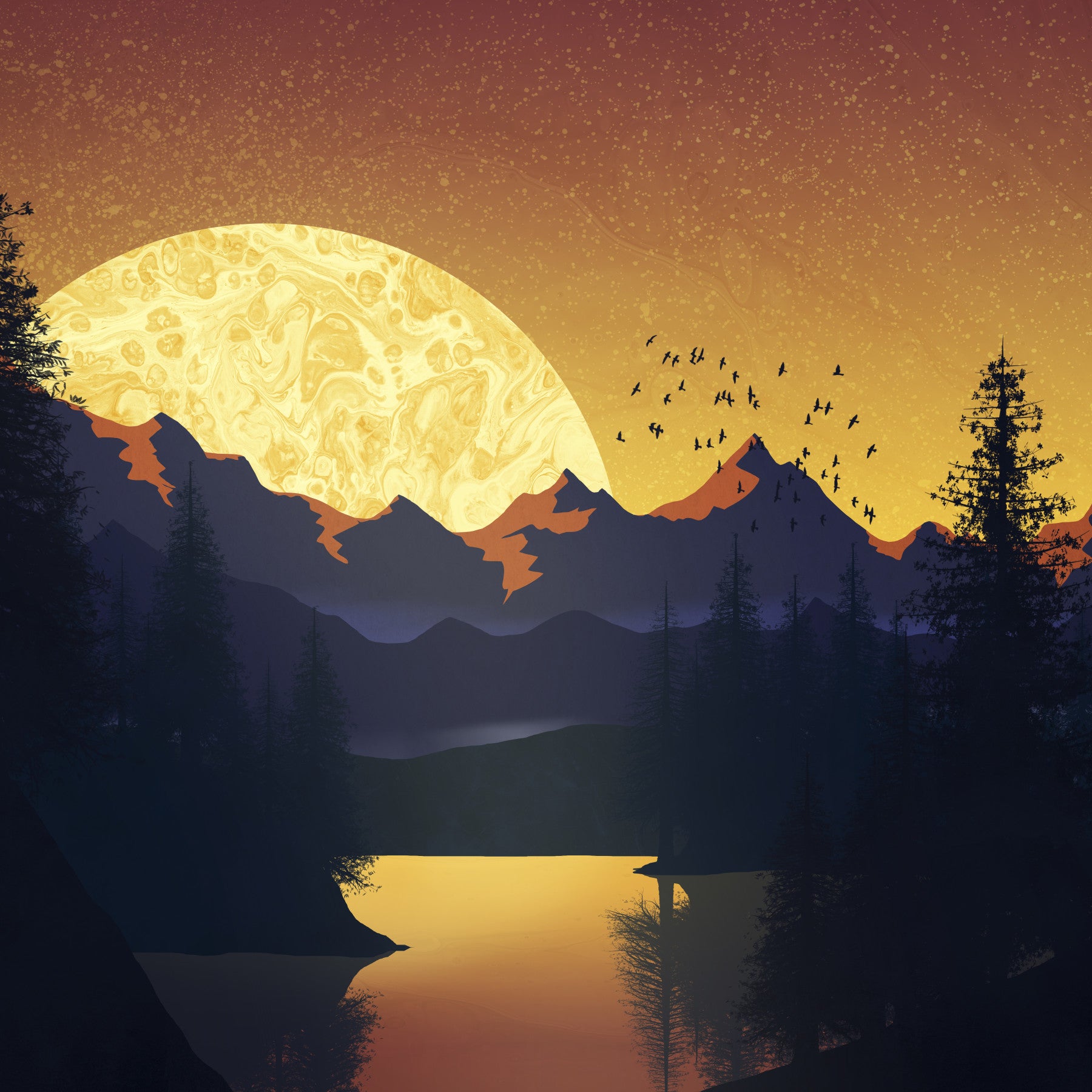 Escape to the serenity of a golden hour landscape with this stunning wallpaper. The image portrays a breathtaking vista of mountains, a calm lake, and a unique marbled moon dominating the sky. The warm sunset hues paint the scene in shades of orange, gold, and deep purple, creating a sense of both warmth and mystery. Silhouetted trees line the lake's edge, their reflections mirroring the tranquil scene. This wallpaper evokes a feeling of peace, tranquility, and the beauty of untouched nature.