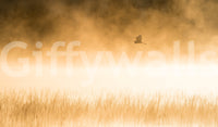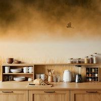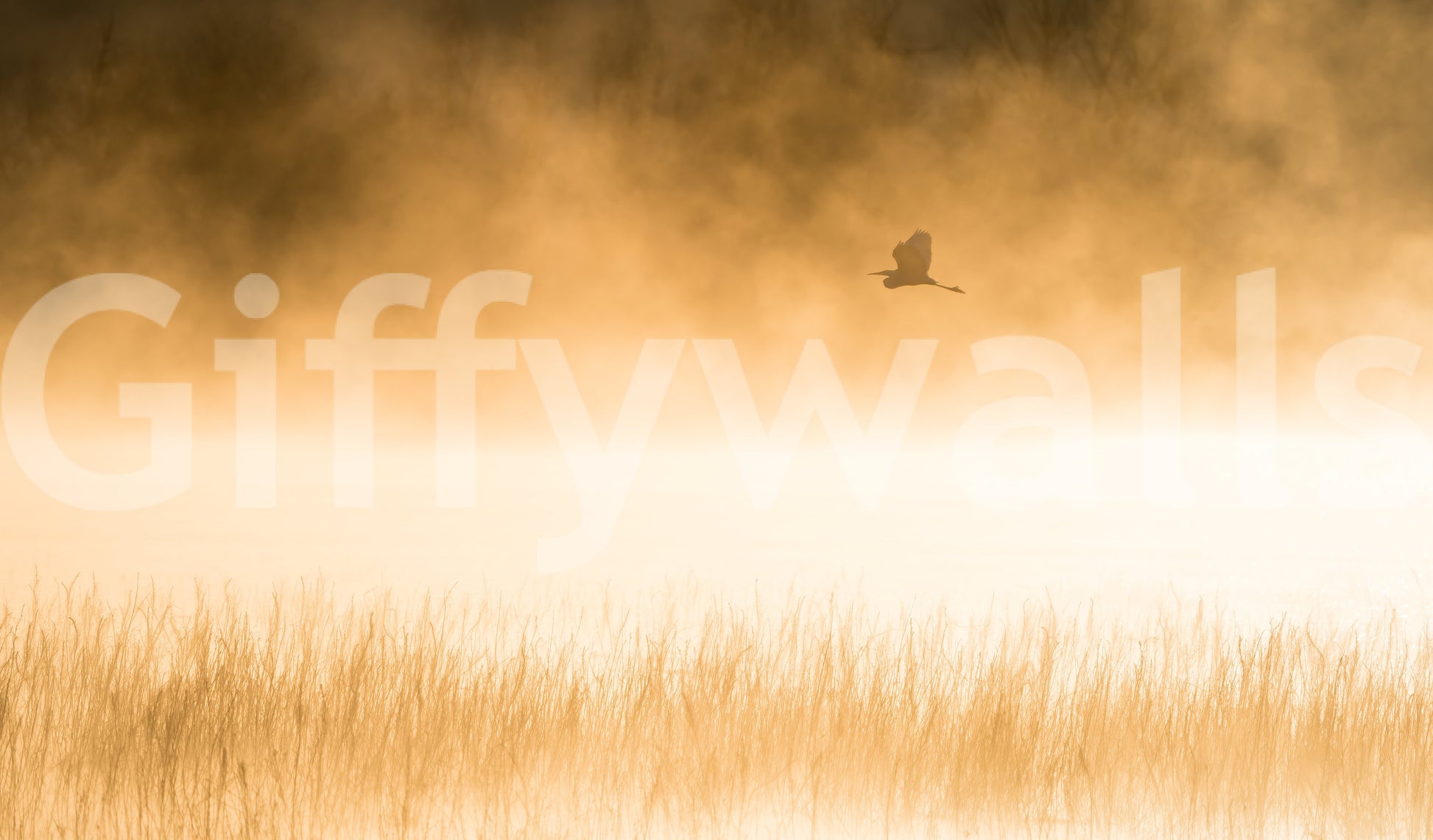Invite tranquillity into your space with this scenic wallpaper for walls. It showcases a heron in flight over misty grasslands bathed in golden light. The design uses a warm colour palette, creating a serene and inviting ambience. Ideal for living rooms, bedrooms, or offices, this wallpaper offers a peaceful escape and brings the beauty of nature indoors. The simple yet elegant imagery complements both modern and rustic interiors.