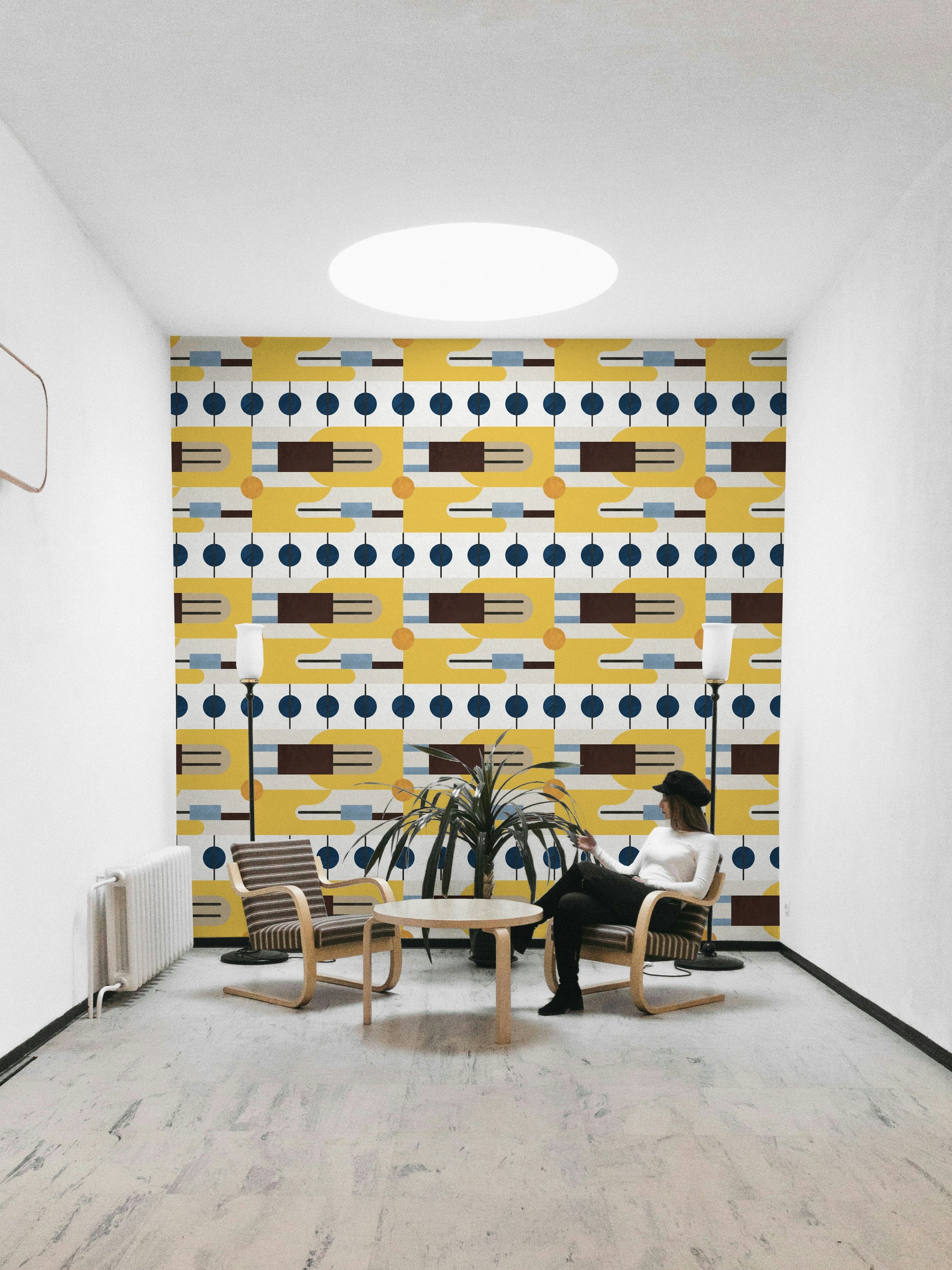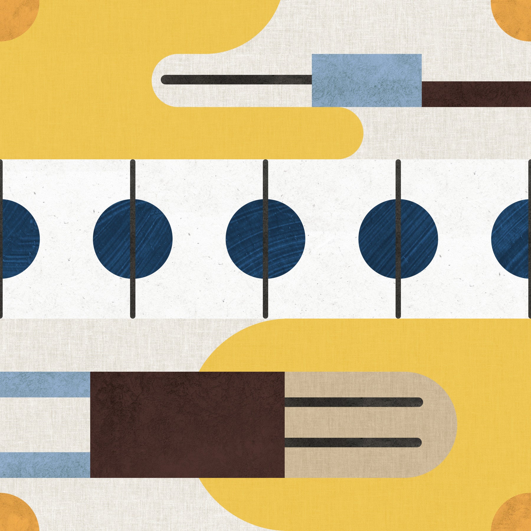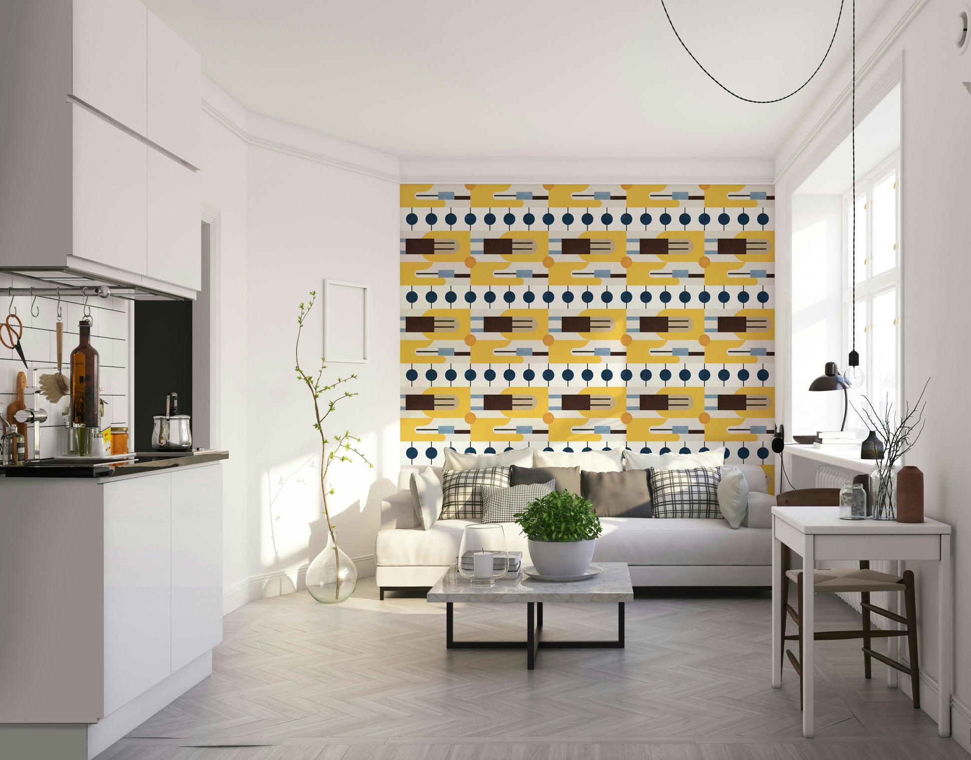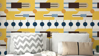 Inspired by the warm glow of golden hour, this wallpaper presents a harmonious blend of earthy tones and geometric forms. The interplay of yellow, blue, and brown hues evokes a feeling of warmth and tranquility. The abstract shapes and subtle textures create a visually interesting yet understated design that complements various interior styles. Perfect for a living room, bedroom, or even a home office, this wallpaper brings a sense of calm sophistication and understated elegance to your space. Its versatile color palette and modern design make it an ideal choice for those seeking a touch of refined ambiance.