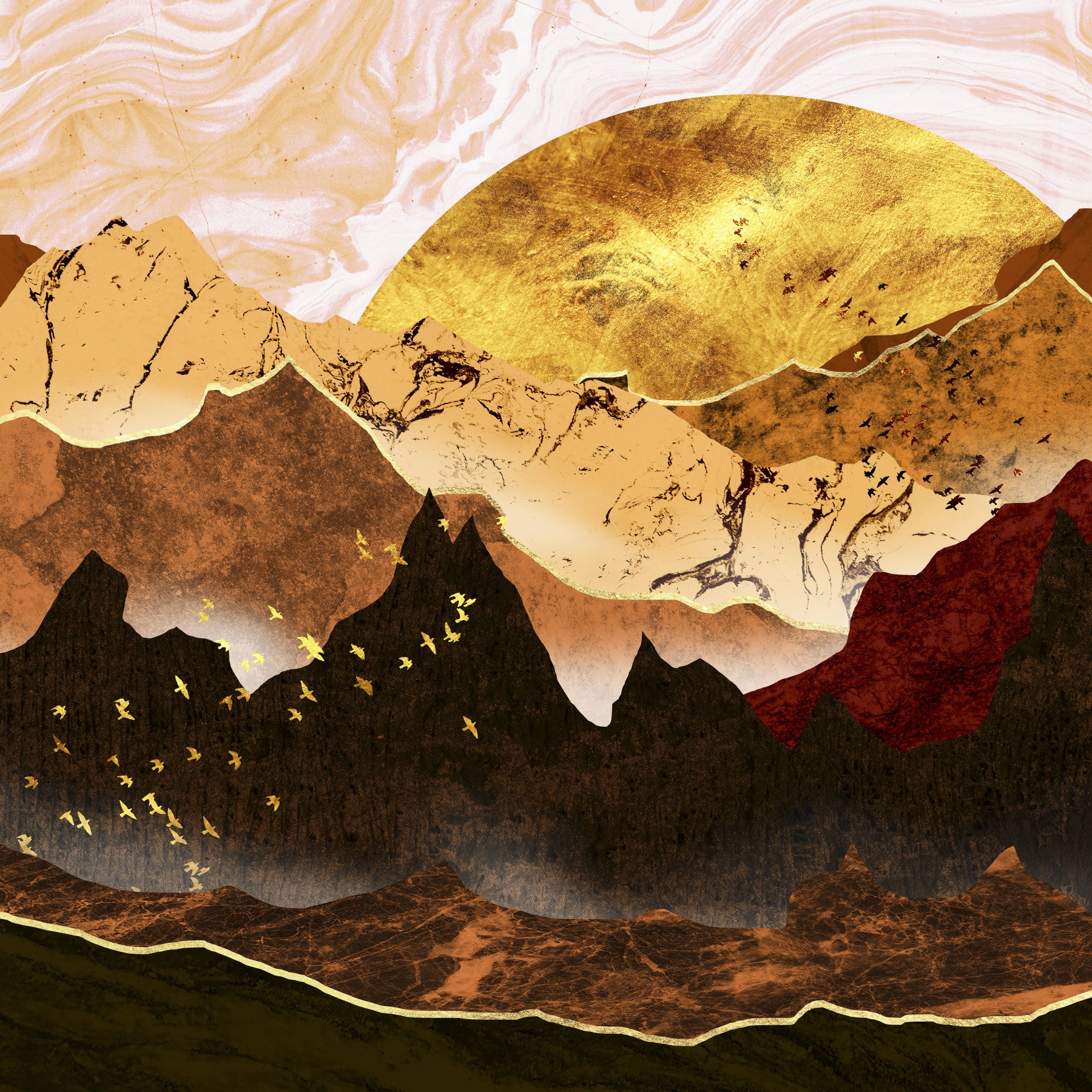 This abstract landscape wallpaper captures the serene beauty of a mountain range bathed in the golden light of sunset. The image uses a rich palette of earthy tones, from deep browns and reds to shimmering gold accents, creating a sense of warmth and tranquility. The texture of the mountains, suggested through a marbled effect, adds depth and visual interest. A flock of birds in flight adds a sense of movement and freedom against the dramatic backdrop of the setting sun. This wallpaper is perfect for those seeking a sophisticated and calming atmosphere in their living spaces.