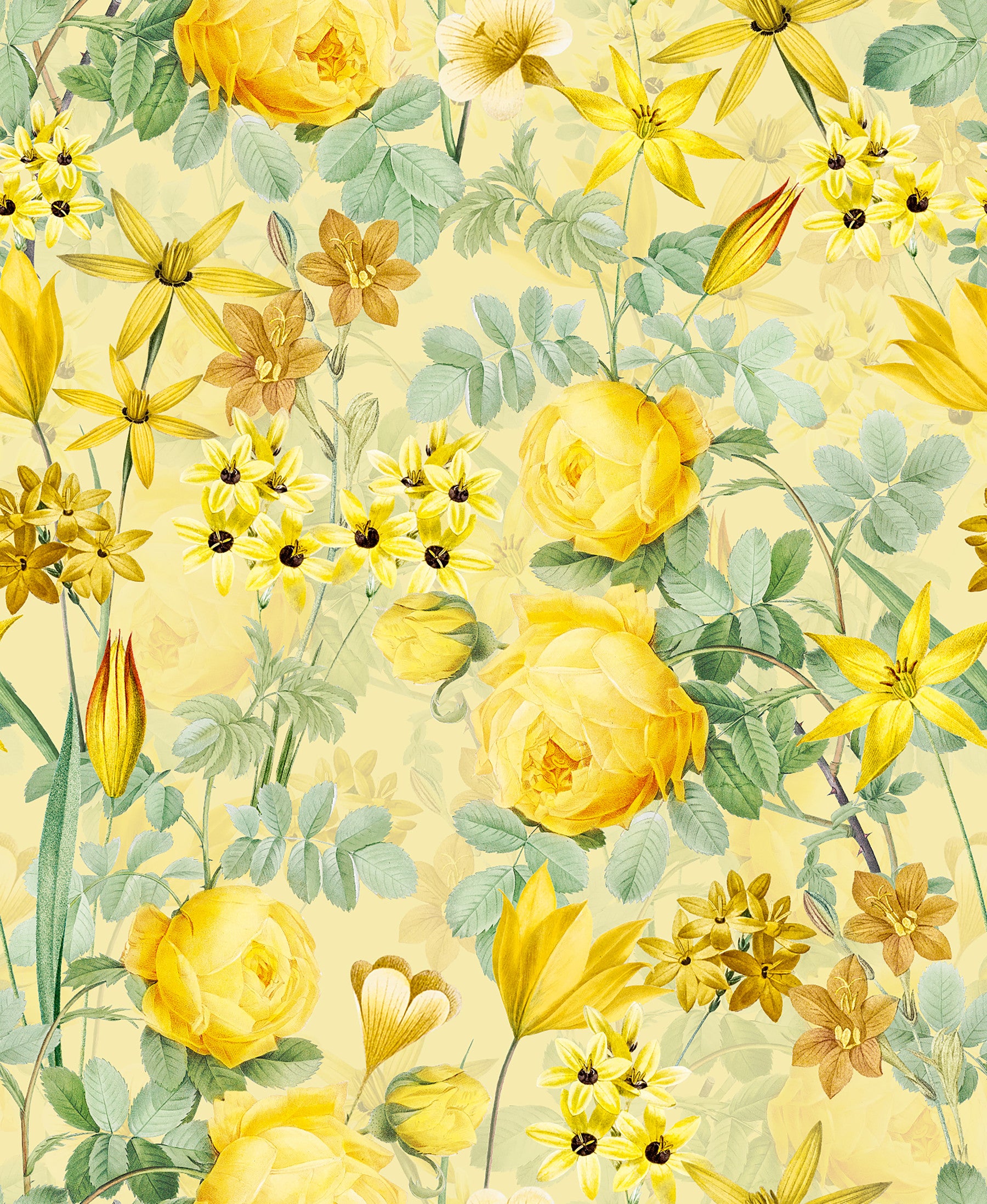 Bathed in a soft, pale yellow light, this wallpaper captures the essence of a sun-drenched garden. Intricate botanical illustrations of yellow roses, delicate star-like flowers, and lush green foliage create a harmonious and elegant pattern. The watercolor-like rendering adds a touch of vintage charm, evoking a feeling of serene tranquility. Perfect for adding a touch of classic sophistication to any room, this wallpaper's calming palette and detailed artwork transform your space into a haven of peace and beauty. The subtle variations in shades of yellow create a captivating depth and richness, making this a truly unique and timeless design.