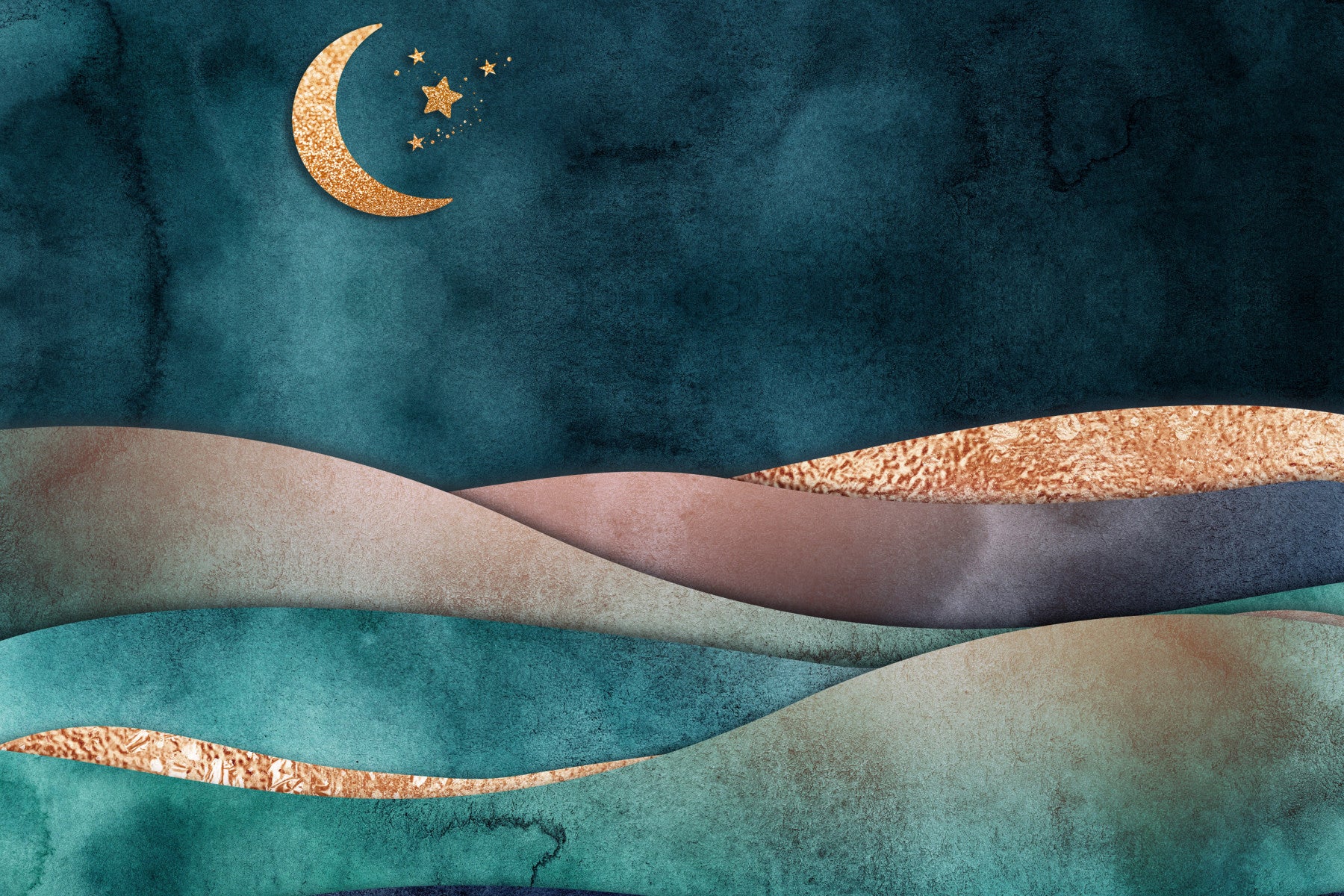 Transform any space with this dreamy landscape design. The wallpaper showcases layers of teal and beige hues, topped with a radiant, glittery golden moon and stars. Crafted with a watercolor style, this wallpaper for walls evokes a sense of calm and sophistication. The design complements interiors in bedrooms, living rooms, or any space needing a peaceful, nature-inspired aesthetic. Make a statement with this stylish and elegant design.