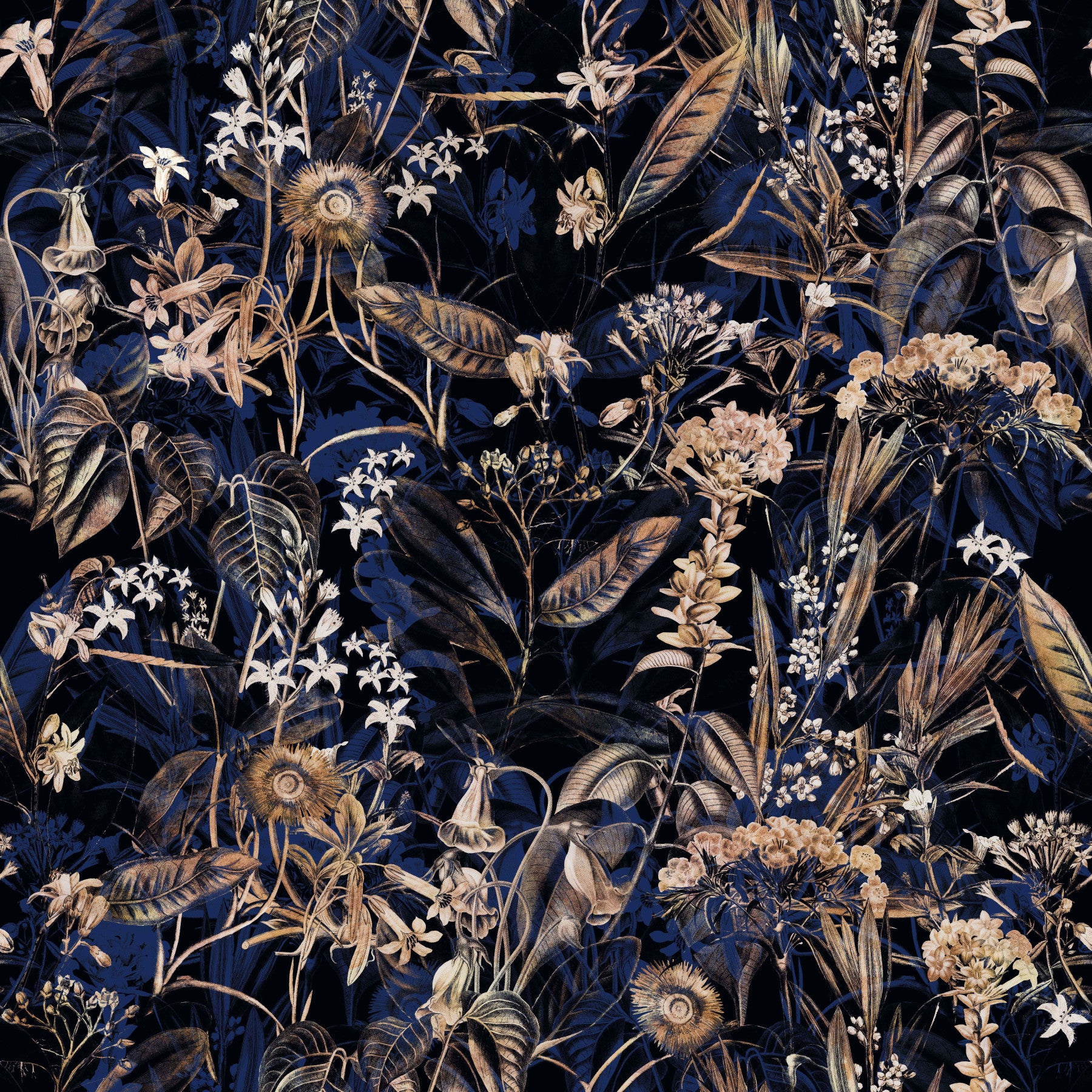 Immerse yourself in a world of nocturnal flora. This design features intricate botanicals in soft gold set against a deep indigo background. It adds a touch of drama to any room. Let this wallpaper for walls transform your bedroom into a restful retreat, or bring a touch of mystery to a dining room. The dark backdrop helps the gold floral elements stand out, creating a captivating interior. Its sophisticated style blends into any décor.