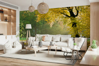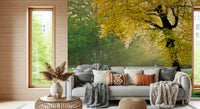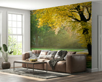 Autumn tree in sunlight. Immerse yourself in the warm embrace of "Golden Radiance," a captivating piece of wall décor that evokes the serene beauty of an autumn morning. This artwork showcases a majestic tree, its canopy ablaze with leaves painted in hues of brilliant gold, radiating a soft, ethereal light. The sunlight filters through the foliage, creating a mesmerising dance of light and shadow on the lush green meadow below. A tranquil path winds its way through the landscape, inviting you to step into this peaceful sanctuary. "Golden Radiance" brings a sense of warmth, tranquility, and natural beauty to any room. Elevate your living space with this radiant vista, capturing the essence of autumn's fleeting, golden moments, infusing your surroundings with a sense of serenity and natural splendour.