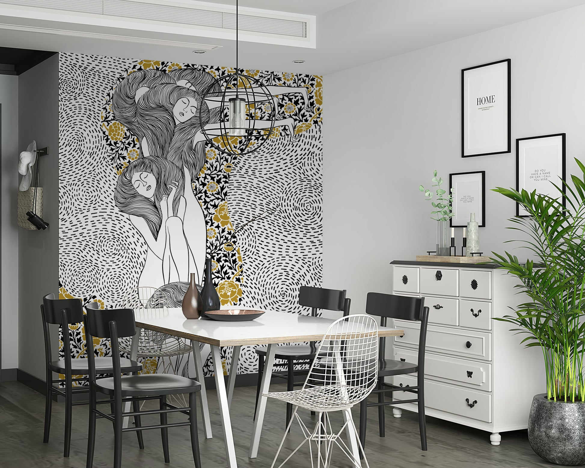 Invite a tranquil yet visually compelling atmosphere into your space with this captivating wallpaper for walls. The design features a vertical arrangement of serene female figures, set against a backdrop of stylized blooms and swirling abstract lines in a black, white, and gold palette. This wallpaper introduces a blend of organic and geometric forms, creating a unique blend of classic and contemporary styles. Enhance the walls of your bedroom, study, or living area with a decorative element that will bring a unique and calming effect. Inspired by Klimt's artwork