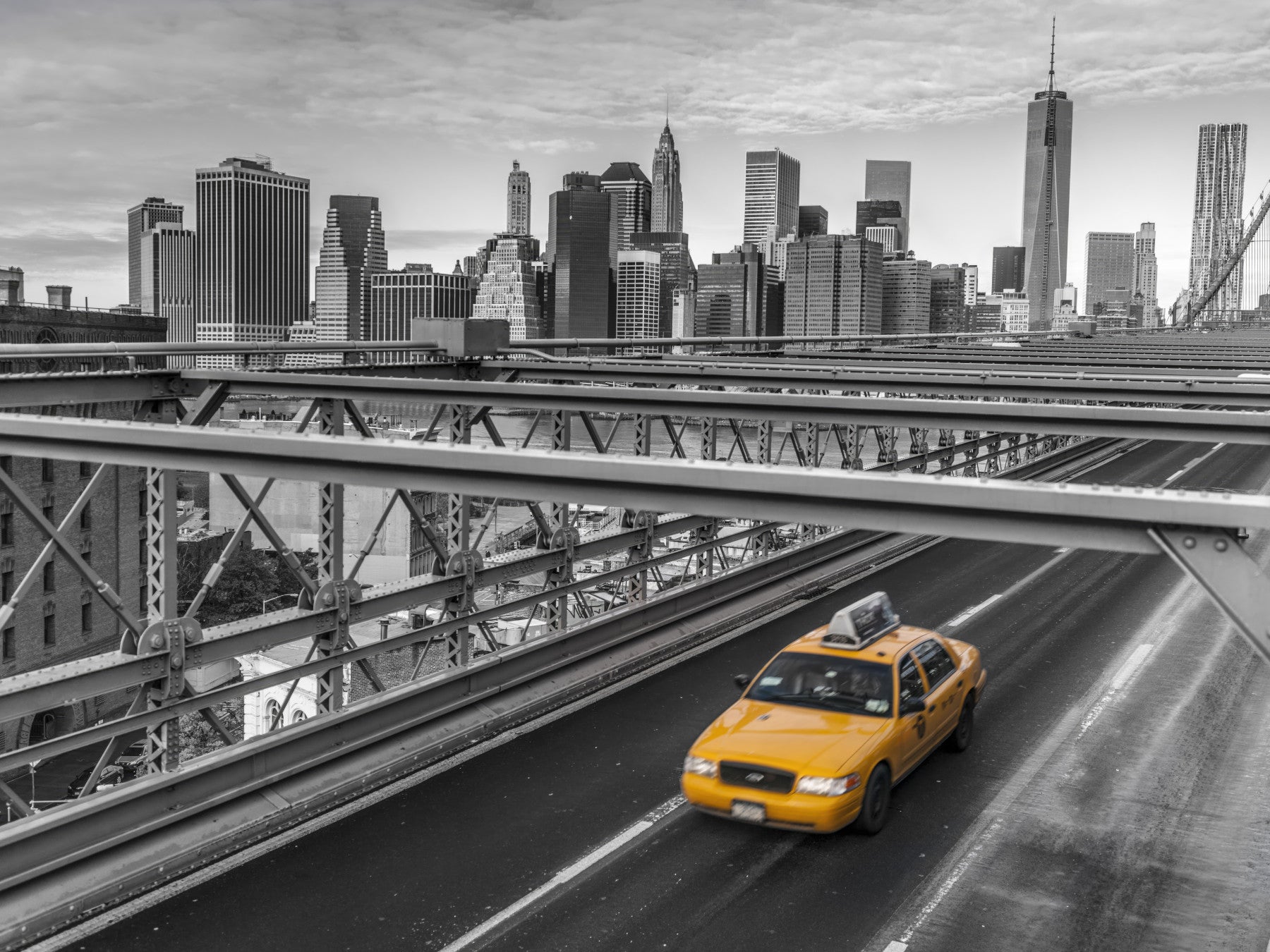 Taxi on Brooklyn Bridge, New York. Witness the timeless allure of New York City with this captivating wallpaper. A vivid yellow taxi races along the Brooklyn Bridge, creating a dynamic focal point against the monochrome backdrop of the iconic skyline. The juxtaposition of the bright, sunlit taxi against the grayscale architecture highlights the city's ability to blend its rich history with contemporary life. This wallpaper is a celebration of New York's enduring energy, perfect for bringing a touch of urban sophistication to any space.