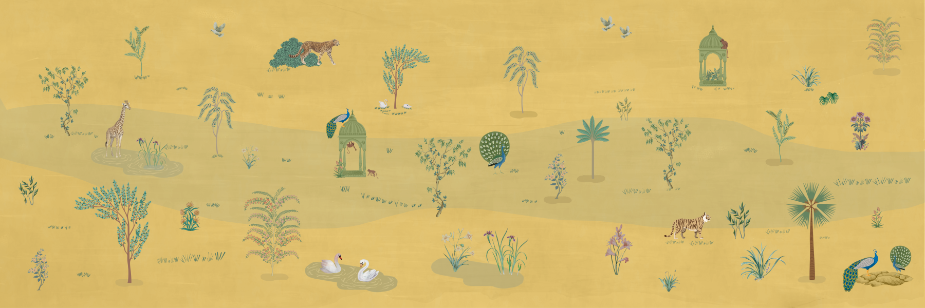 Bring the beauty of the savannah indoors with this sophisticated wallpaper for walls. The design presents a serene scene with animals such as giraffes and peacocks roaming among stylized trees. The golden-yellow backdrop and subtle green accents bring a sense of warmth and nature to any room. This wallpaper makes a great addition to a living room, bedroom, or home office, creating an inviting and elegant space that reflects a love for nature and design.