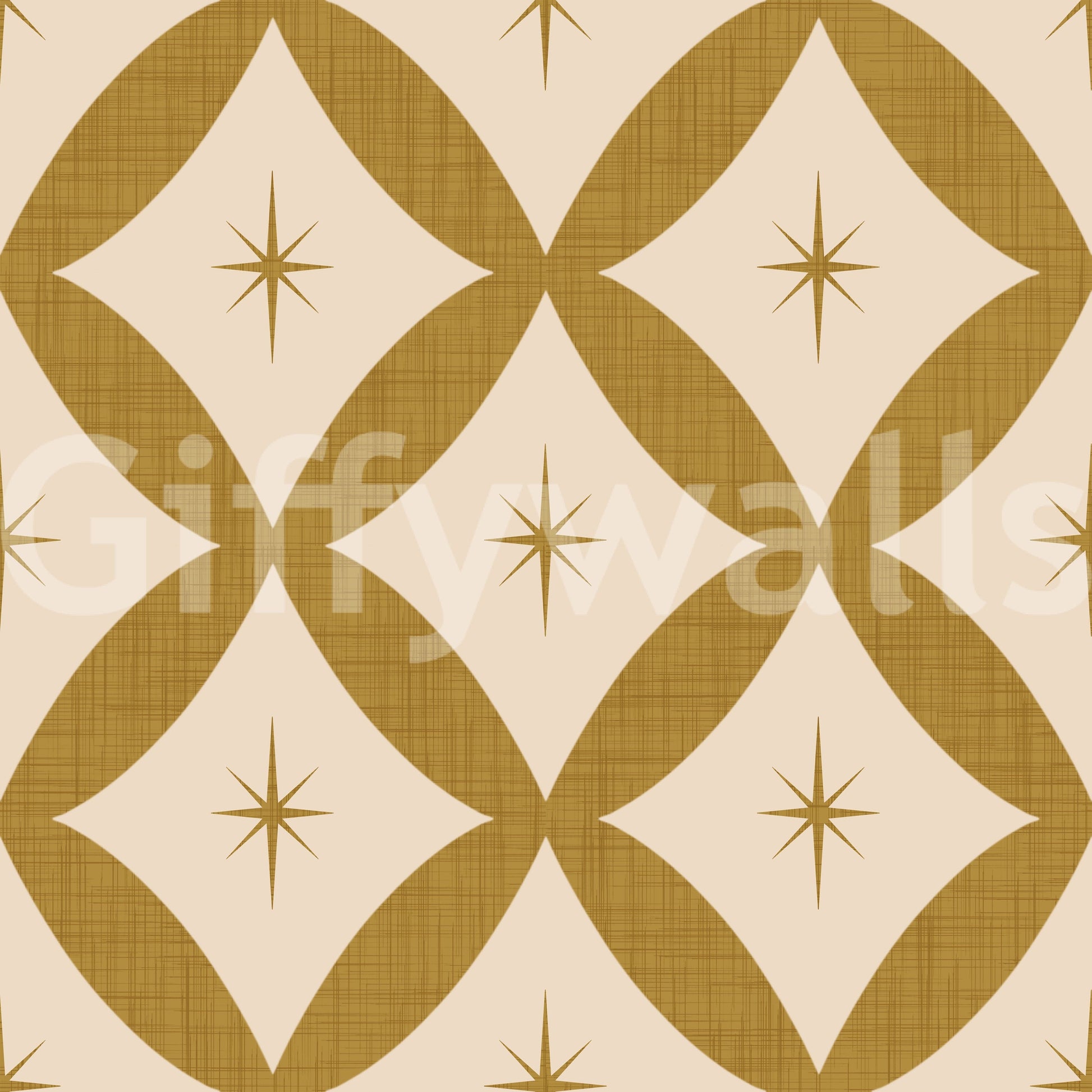 Mid-century inspired wallpaper with interlocking golden diamonds and delicate star accents.