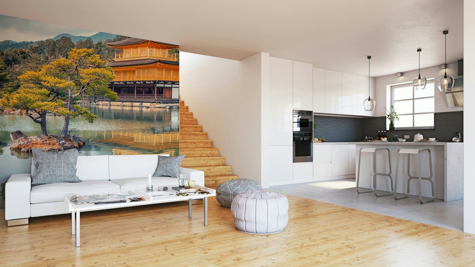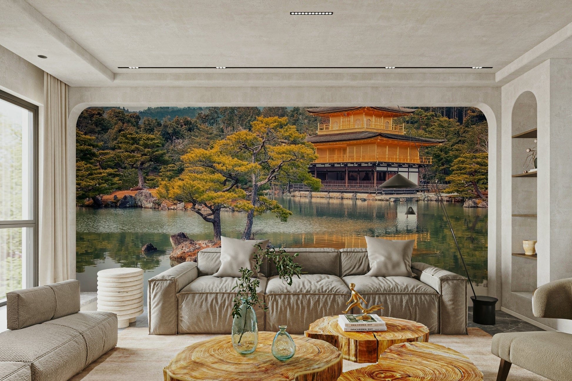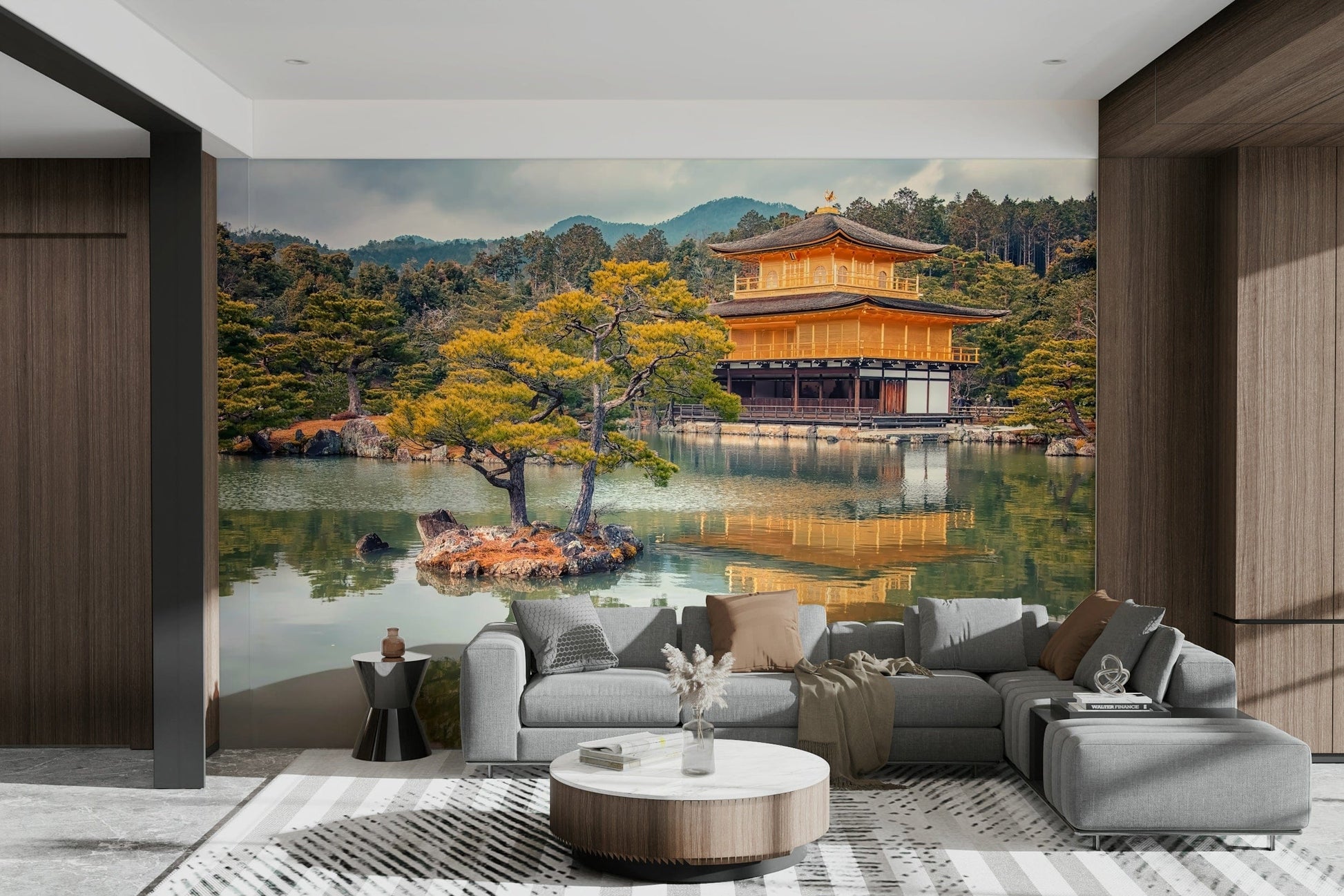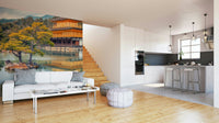Transform any room into a tranquil retreat with this beautiful wallpaper for walls. A radiant golden temple stands elegantly beside a still lake. This design uses soft, earthy tones and creates a peaceful mood. Picture it enhancing living rooms, study areas, or bedrooms. It complements wooden furniture, adding a hint of warmth. Introduce harmony to your space with this inspiring vista.