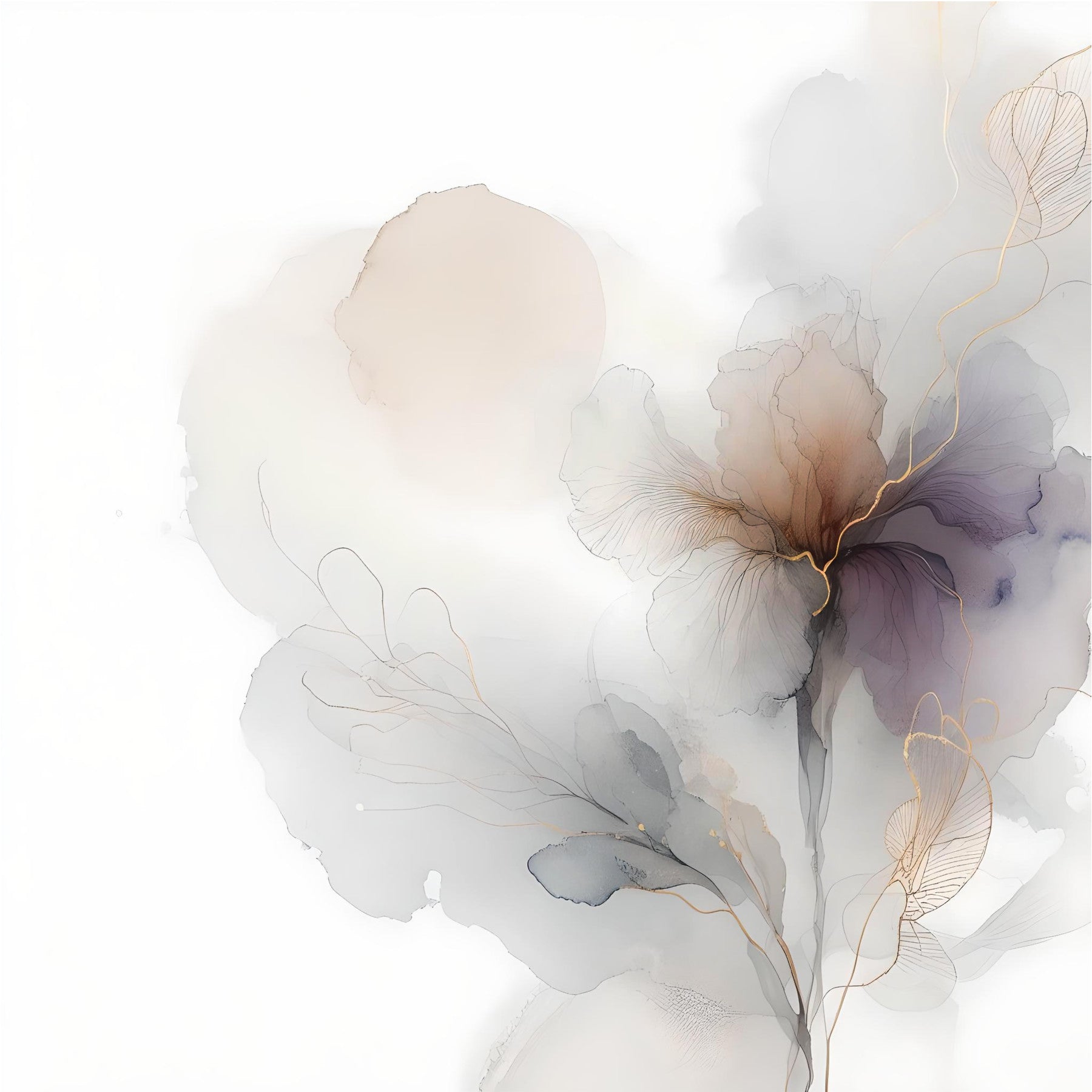 This ethereal wallpaper captures the delicate beauty of abstract florals rendered in soft watercolor washes. Subtle grey, beige, and taupe hues create a calming atmosphere, enhanced by elegant gold linework that delicately traces the flower's form. The overall effect is serene and sophisticated, perfect for adding a touch of understated elegance to any room. The flowing lines and soft color palette evoke a sense of tranquility and peaceful contemplation, making it ideal for bedrooms, living rooms, or meditation spaces. This dreamy design invites relaxation and quiet reflection, transforming any space into a sanctuary of calm.