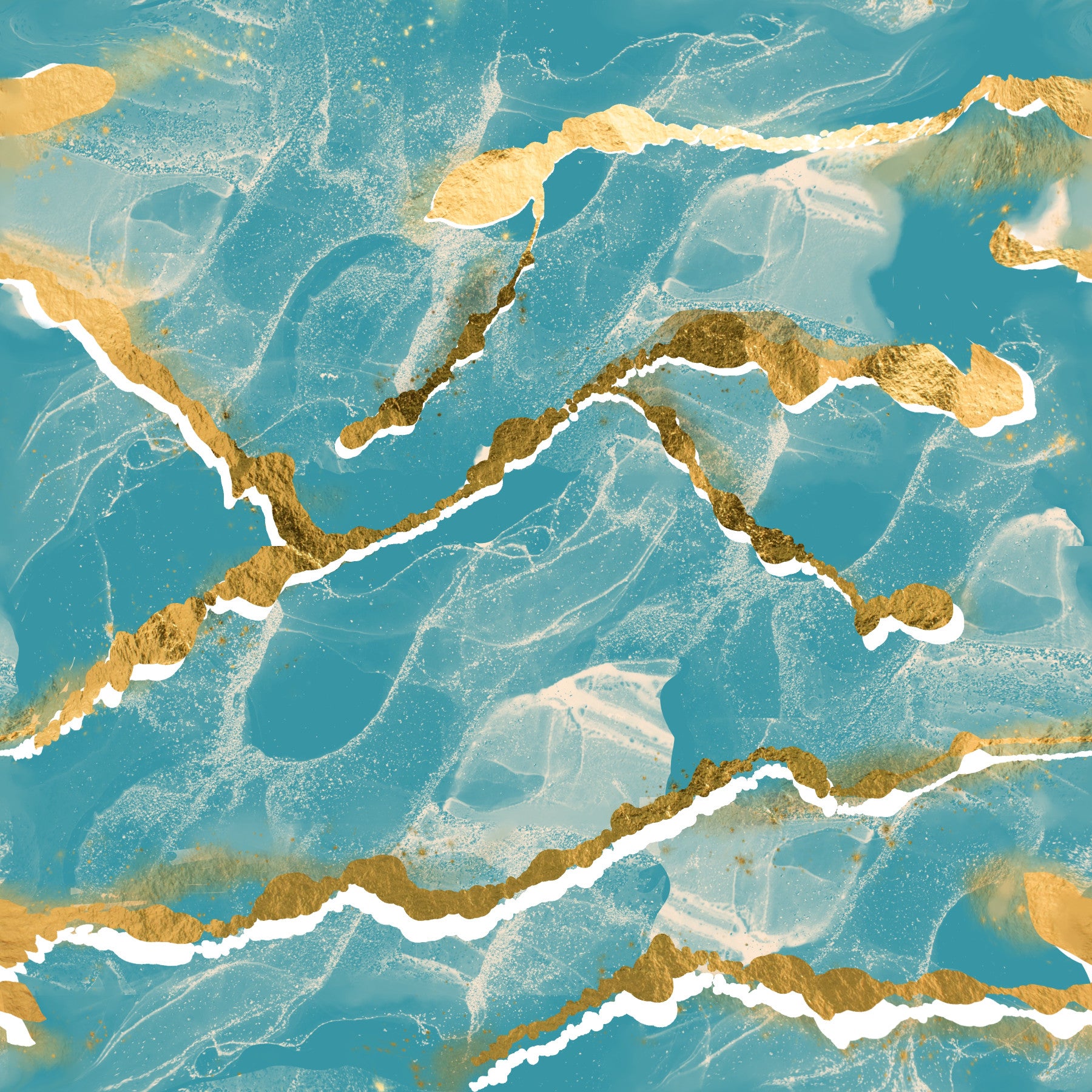 A modern abstract wall mural depicting a stunning tropical teal and gold Marble Wallpaper pattern.